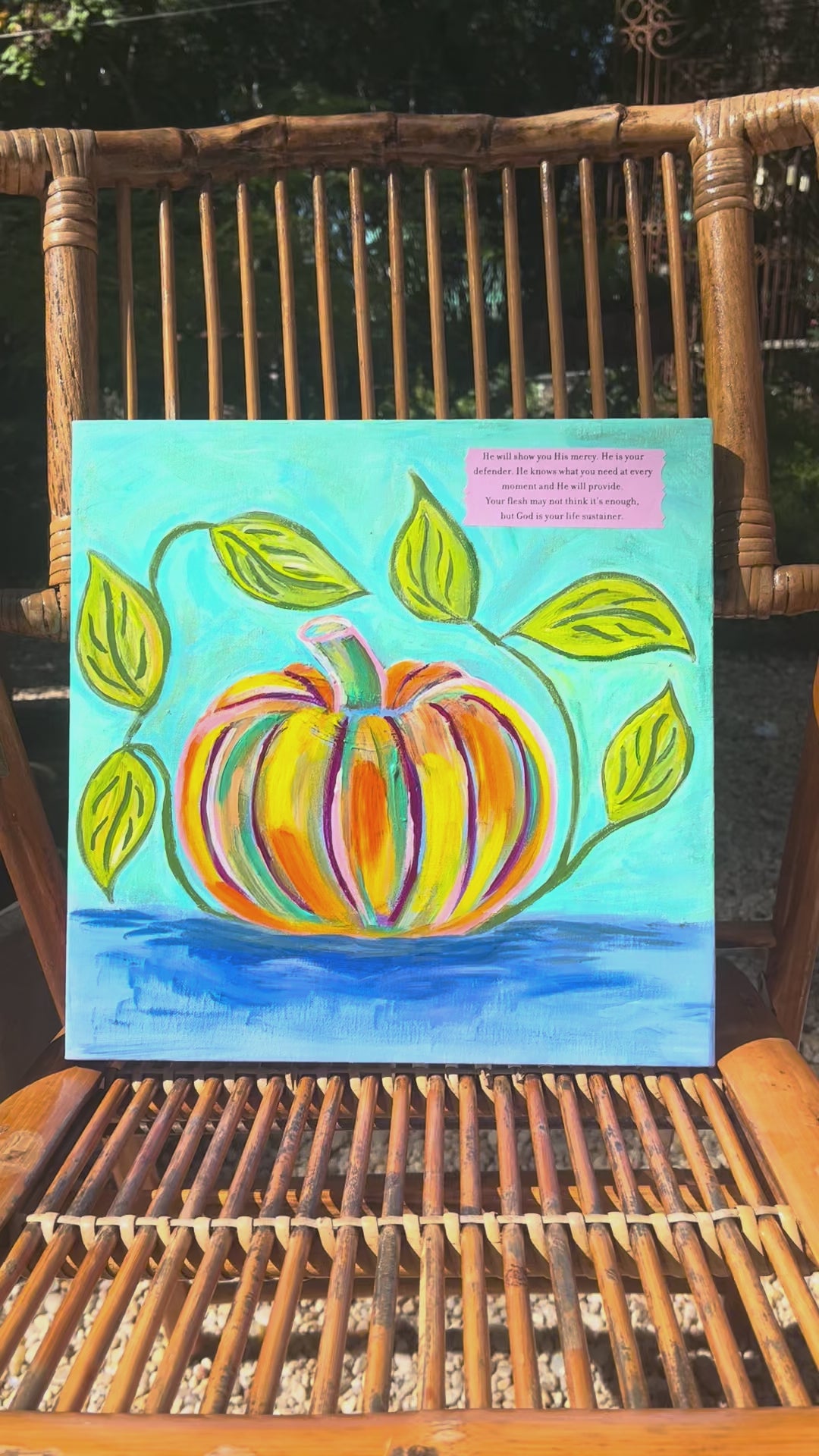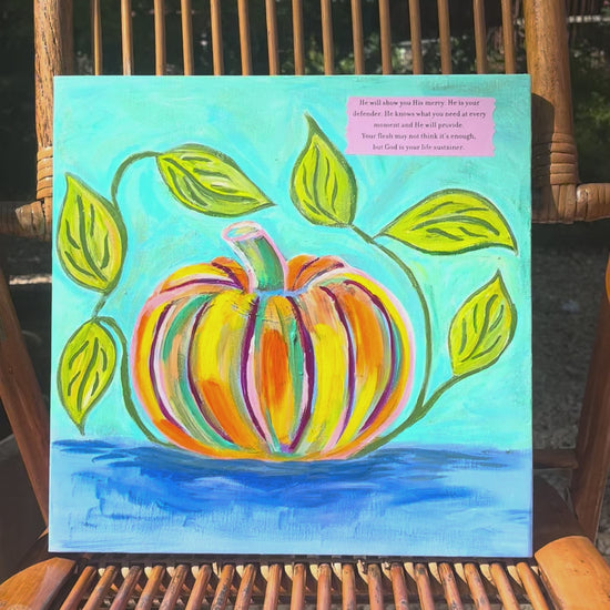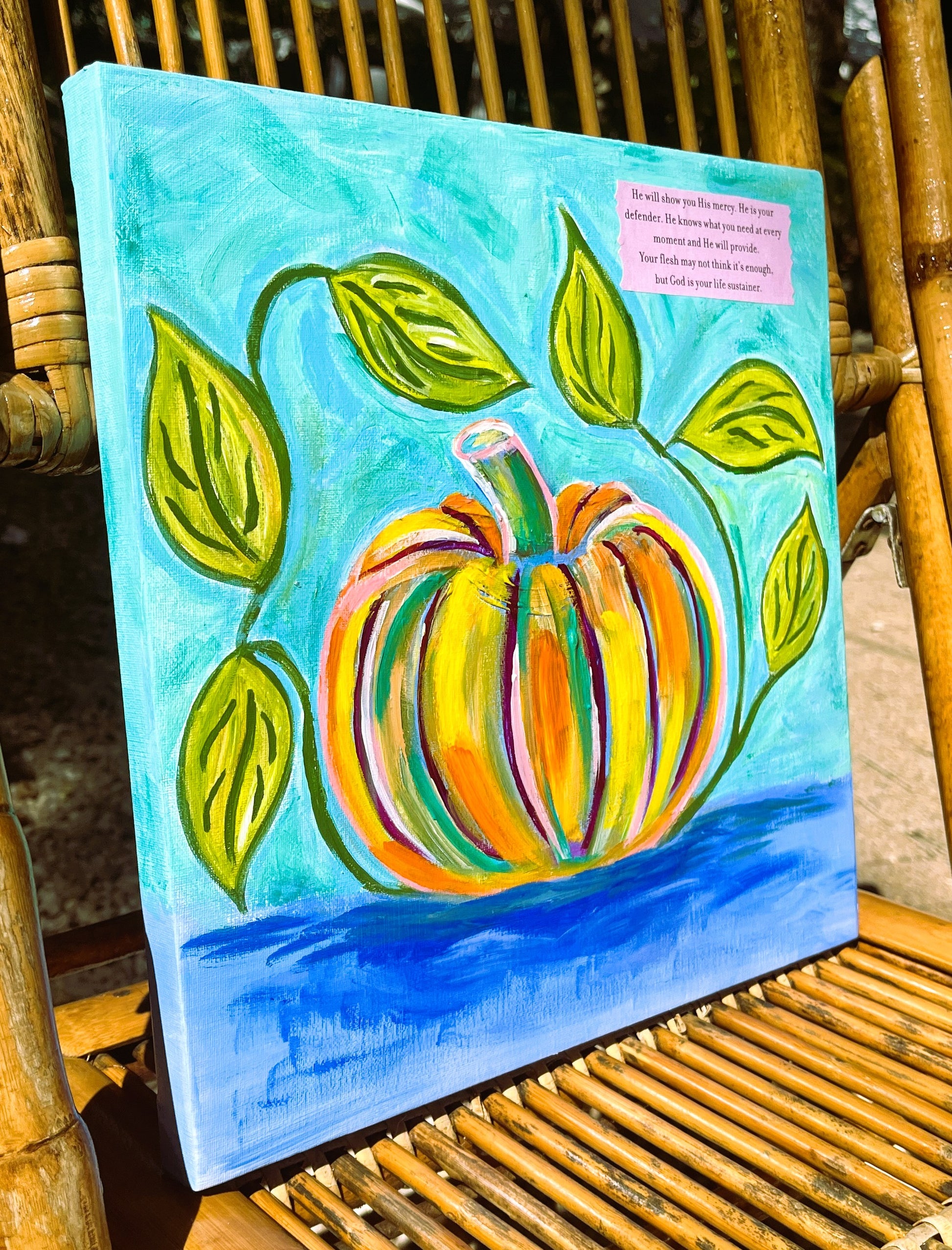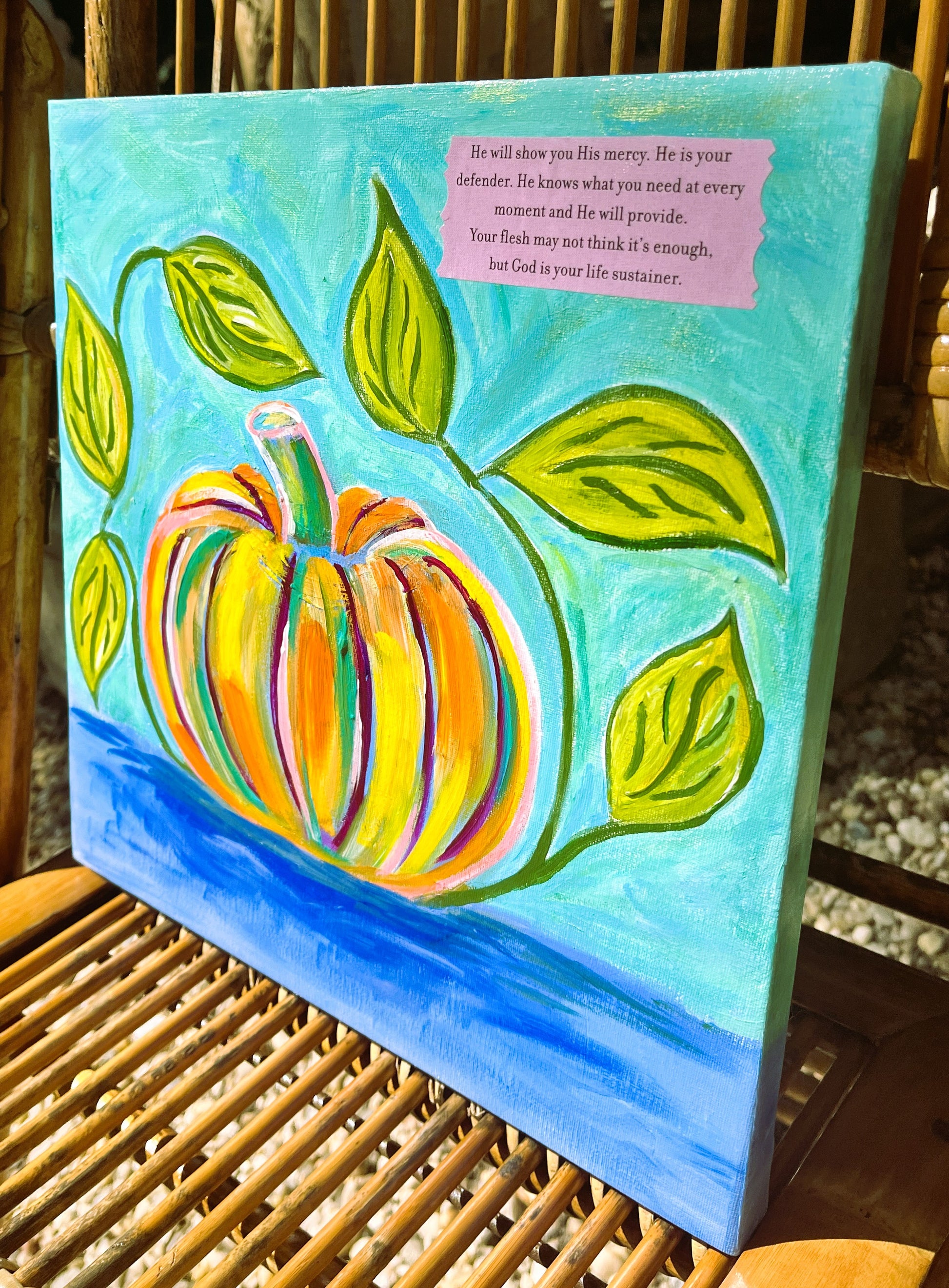 "He Will Provide" captures faith and hope through a stunning visual narrative. This piece features a lush pumpkin with vines rendered in vibrant turquoise and blue hues, creating an unexpected yet harmonious color palette that draws the eye. Perfect for those seeking meaningful art that combines natural beauty with spiritual encouragement, this work transforms any space into a sanctuary of positive affirmation and artistic sophistication.