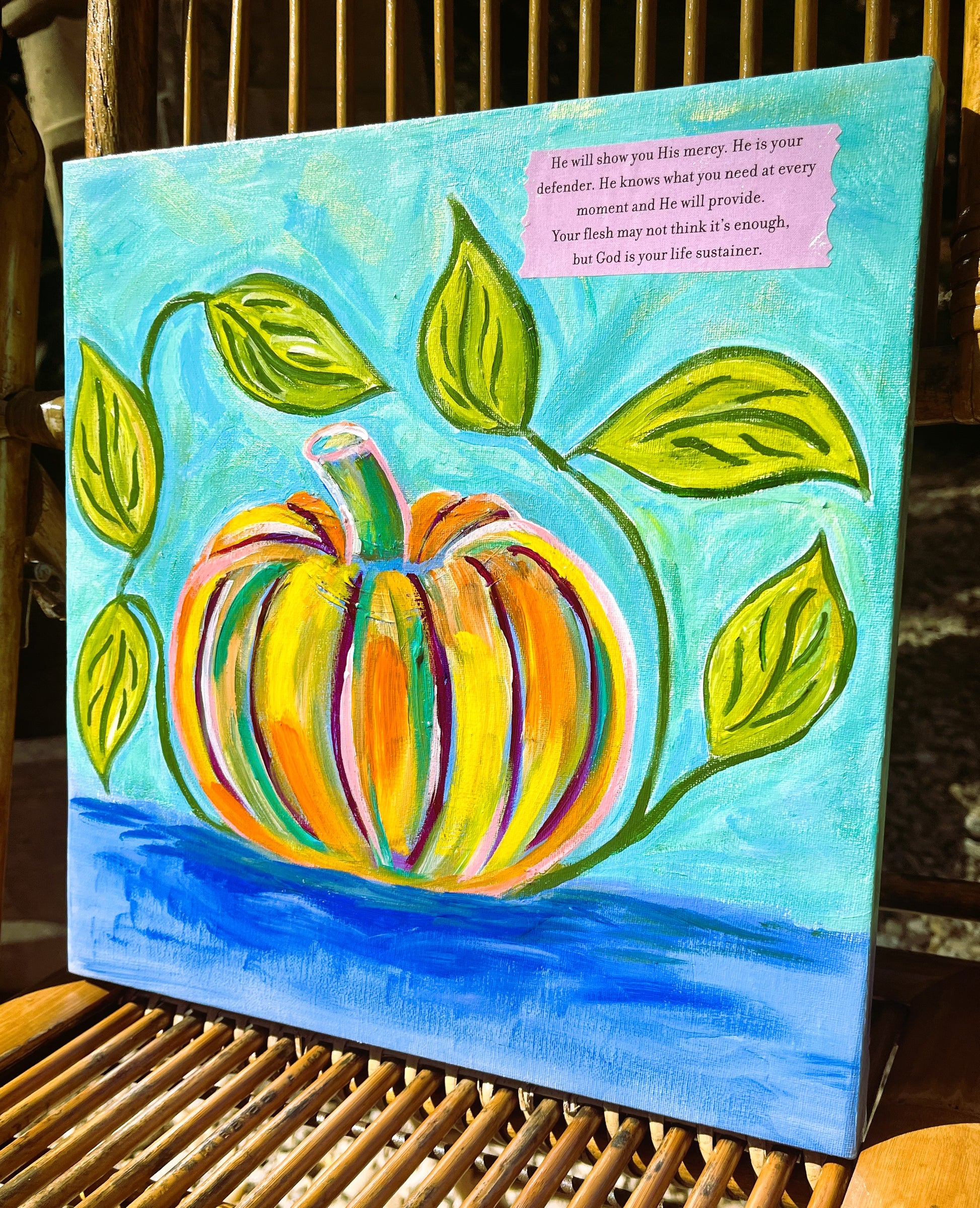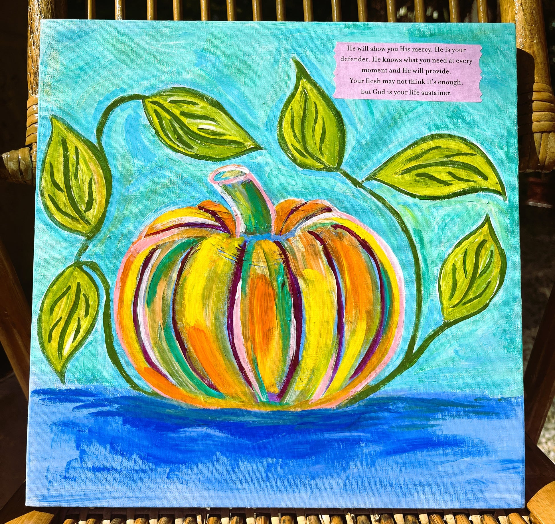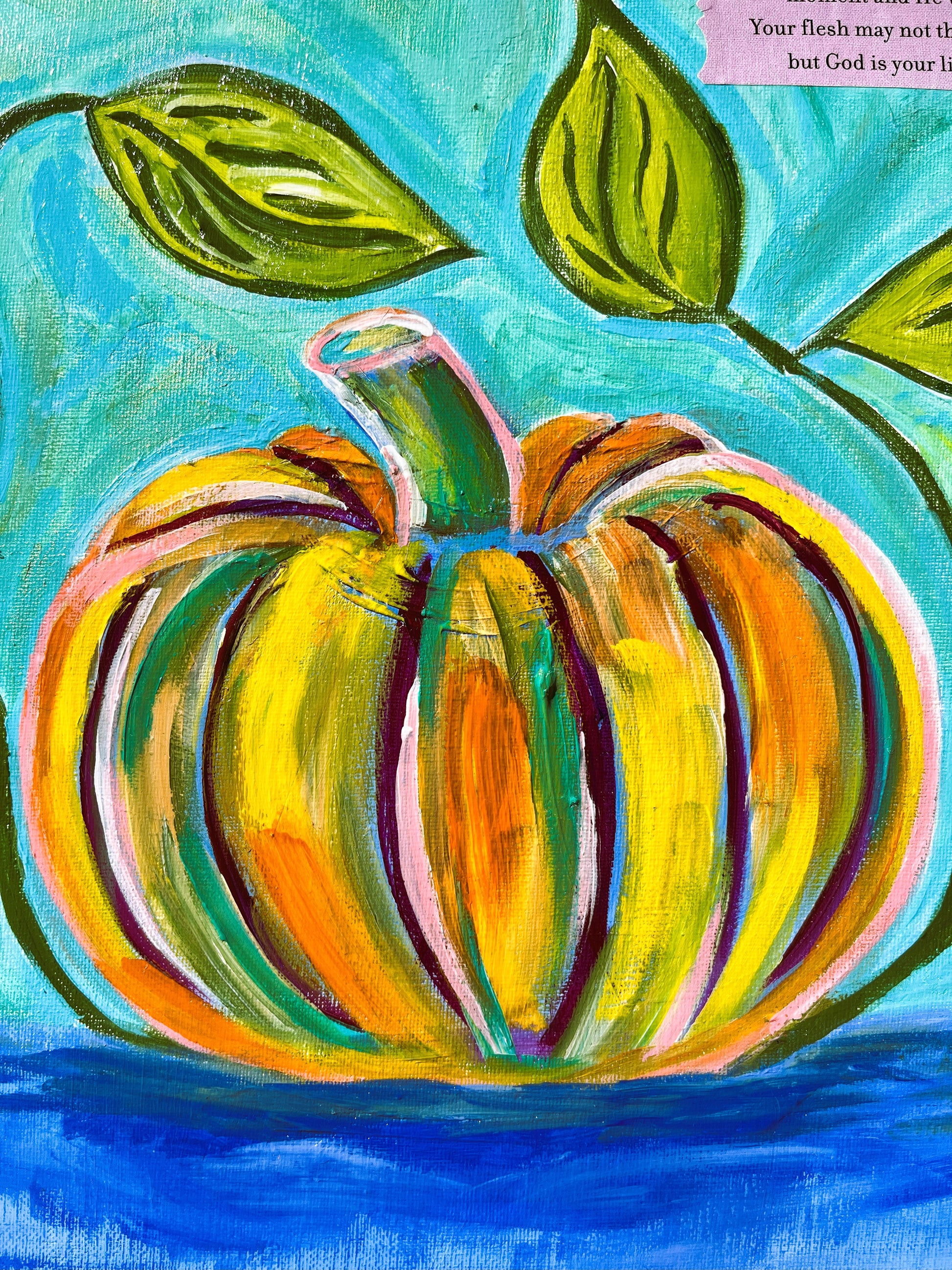 "He Will Provide" captures faith and hope through a stunning visual narrative. This piece features a lush pumpkin with vines rendered in vibrant turquoise and blue hues, creating an unexpected yet harmonious color palette that draws the eye. Perfect for those seeking meaningful art that combines natural beauty with spiritual encouragement, this work transforms any space into a sanctuary of positive affirmation and artistic sophistication.