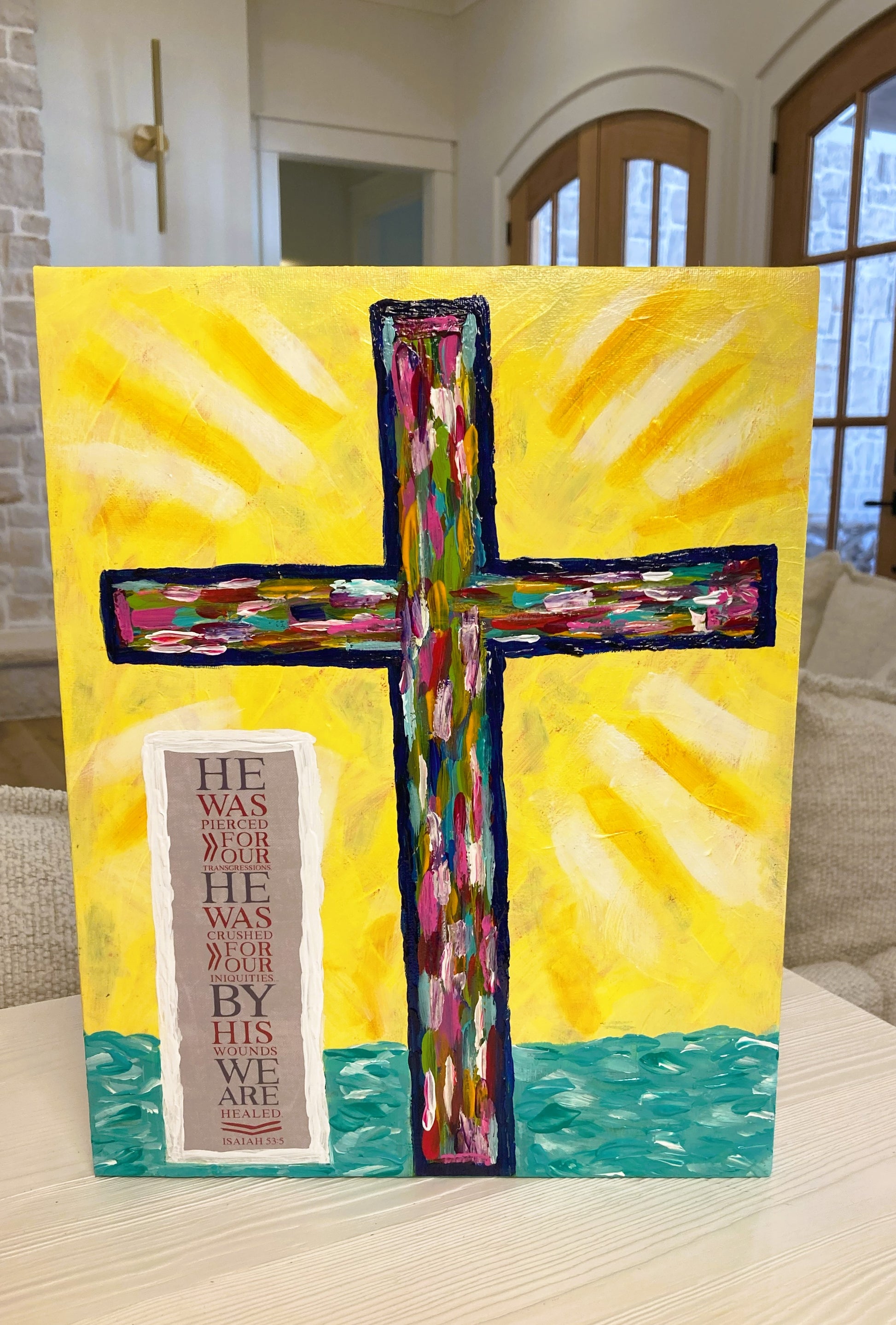 This acrylic canvas artwork features "Isaiah 53:5", a vibrant and prophetic scripture that brings a message of healing and redemption. The bold and striking cross imagery adds a powerful element to any living space, making it a meaningful addition to your decor.