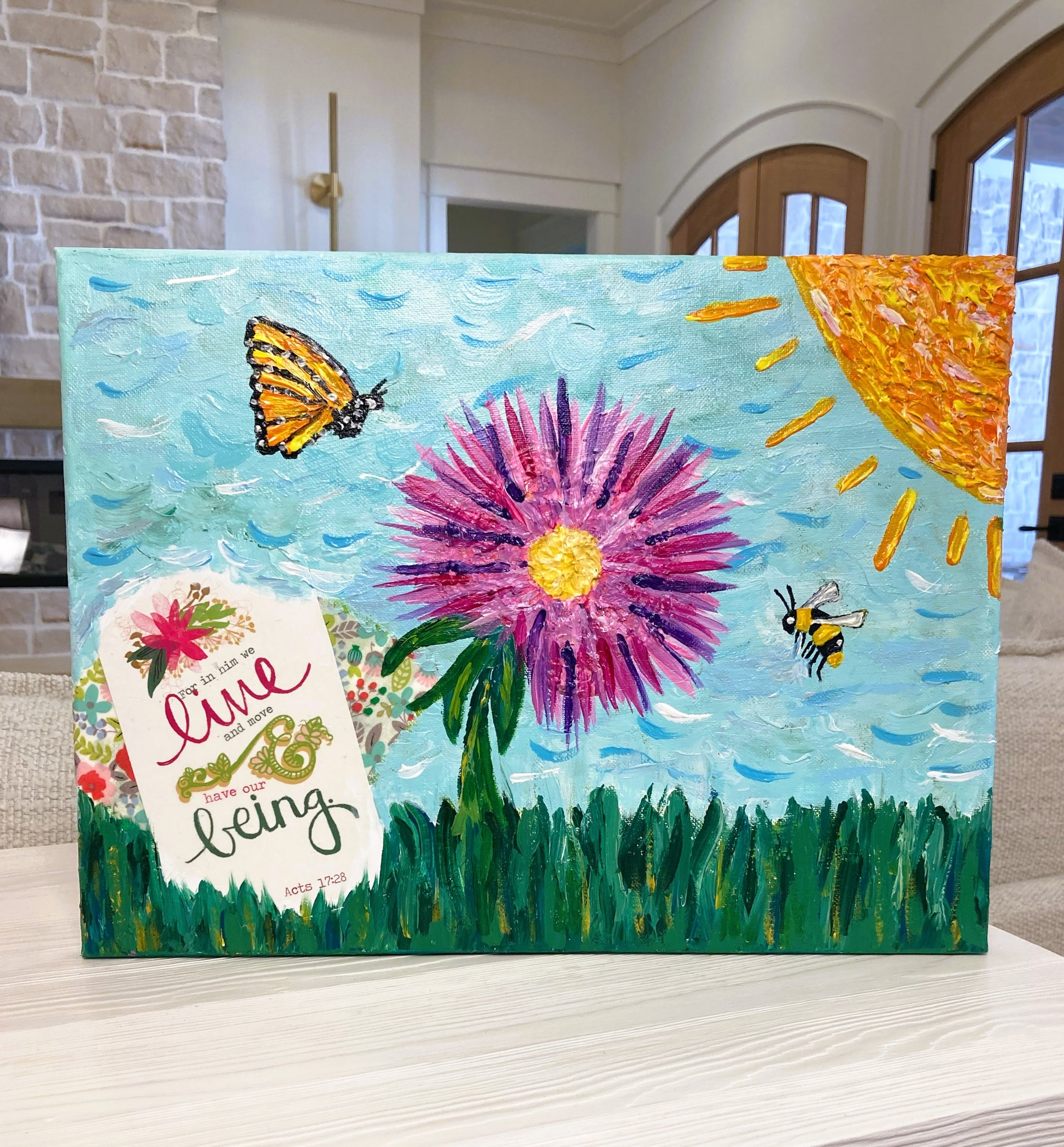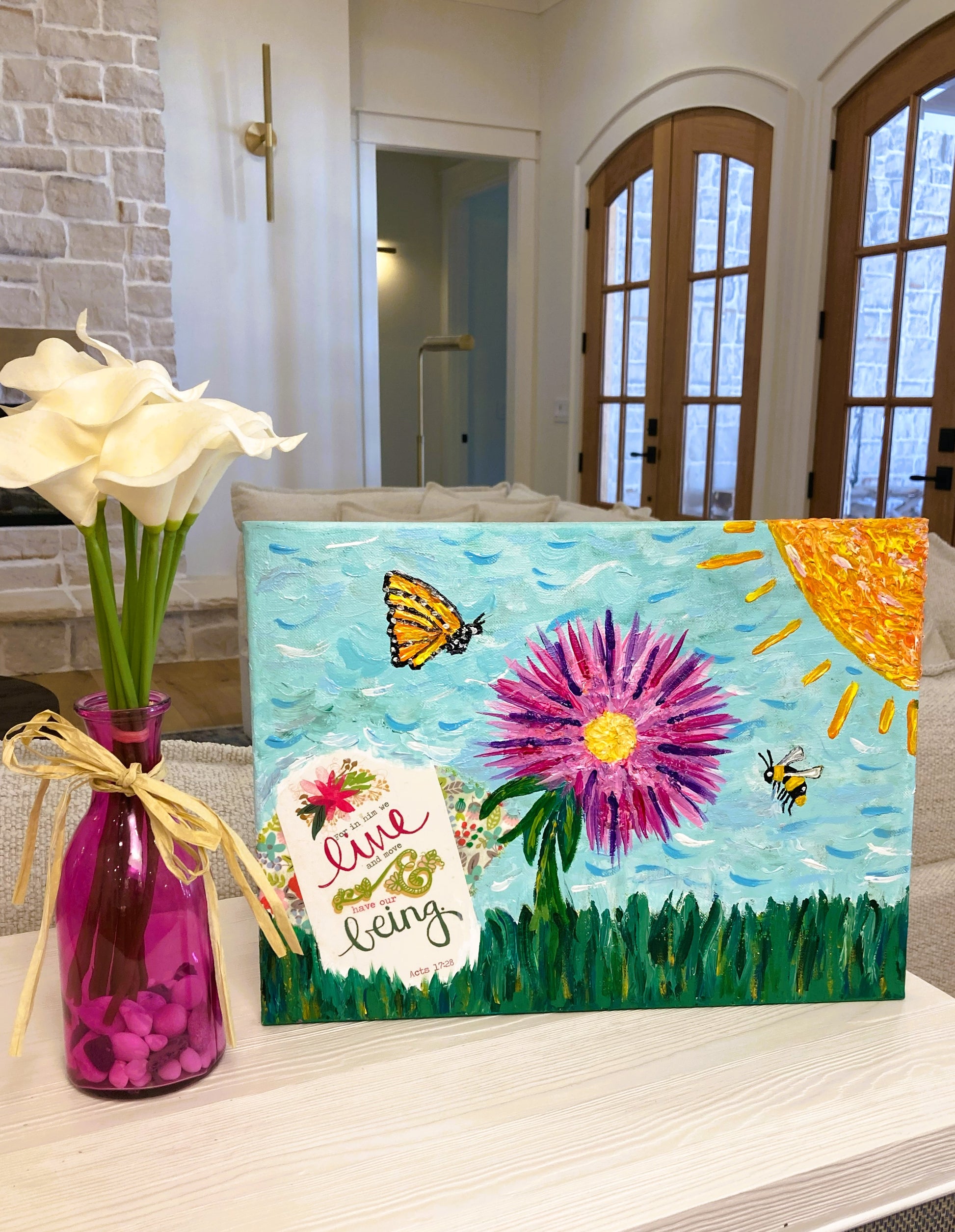 "Live and Move" is a collection of colorful abstract art inspired by the natural world. Each piece, featuring elements such as butterflies, bees, sunshine, and flowers, evokes a sense of vitality and joy. With its uplifting imagery, it serves as a daily reminder to embrace the present moment and live fully as stated in Acts 17:28.
