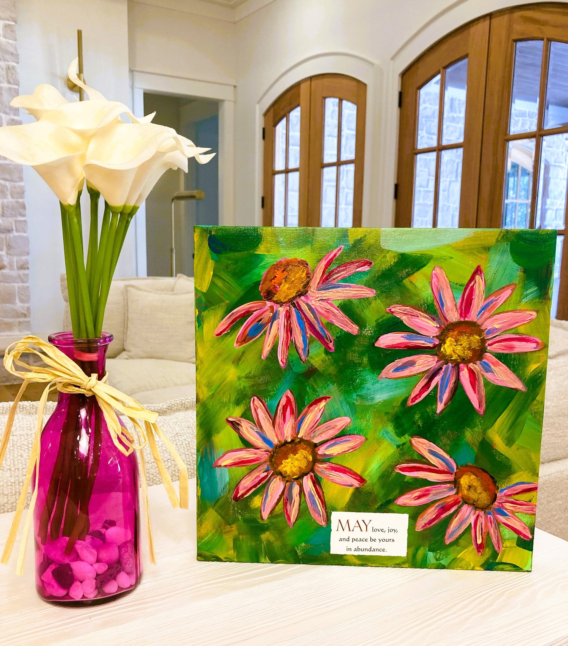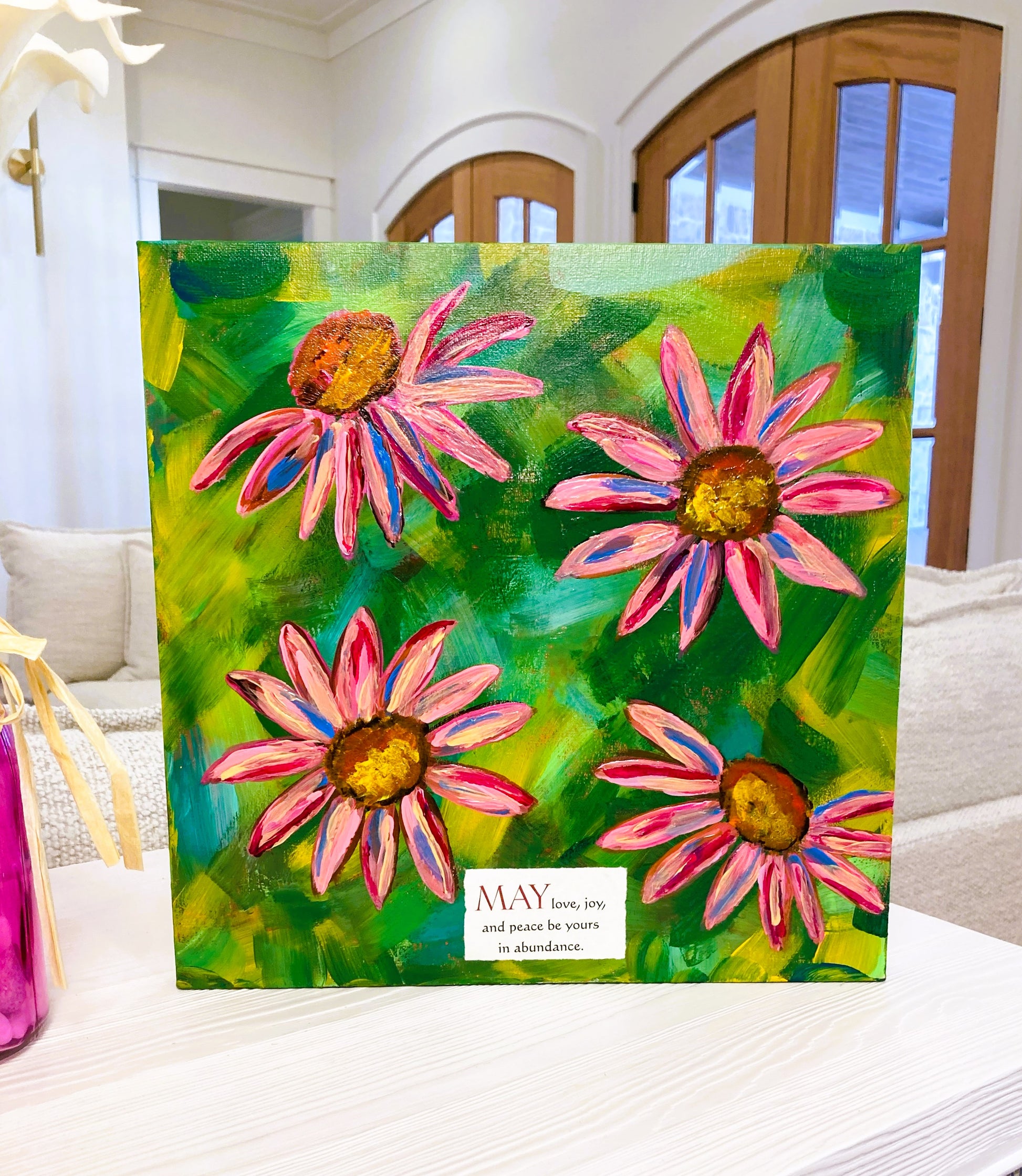 Experience the fullness of the fruits of the Spirit with "Love, Joy & Peace." This abstract art piece includes vibrant pink flowers on a tie dye yellow and green background. Representing abundance and the perfect balance of these beautiful colors. Invite love, joy, and peace into your home or office with this unique and inspiring piece.