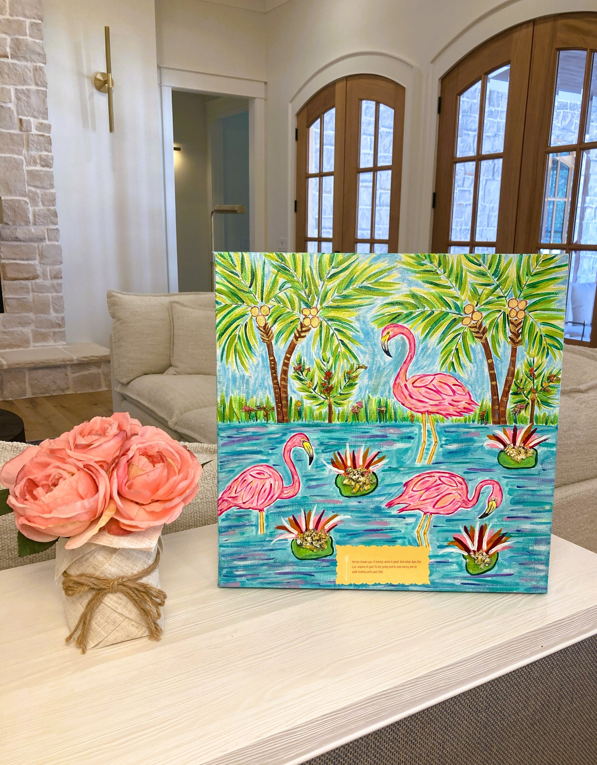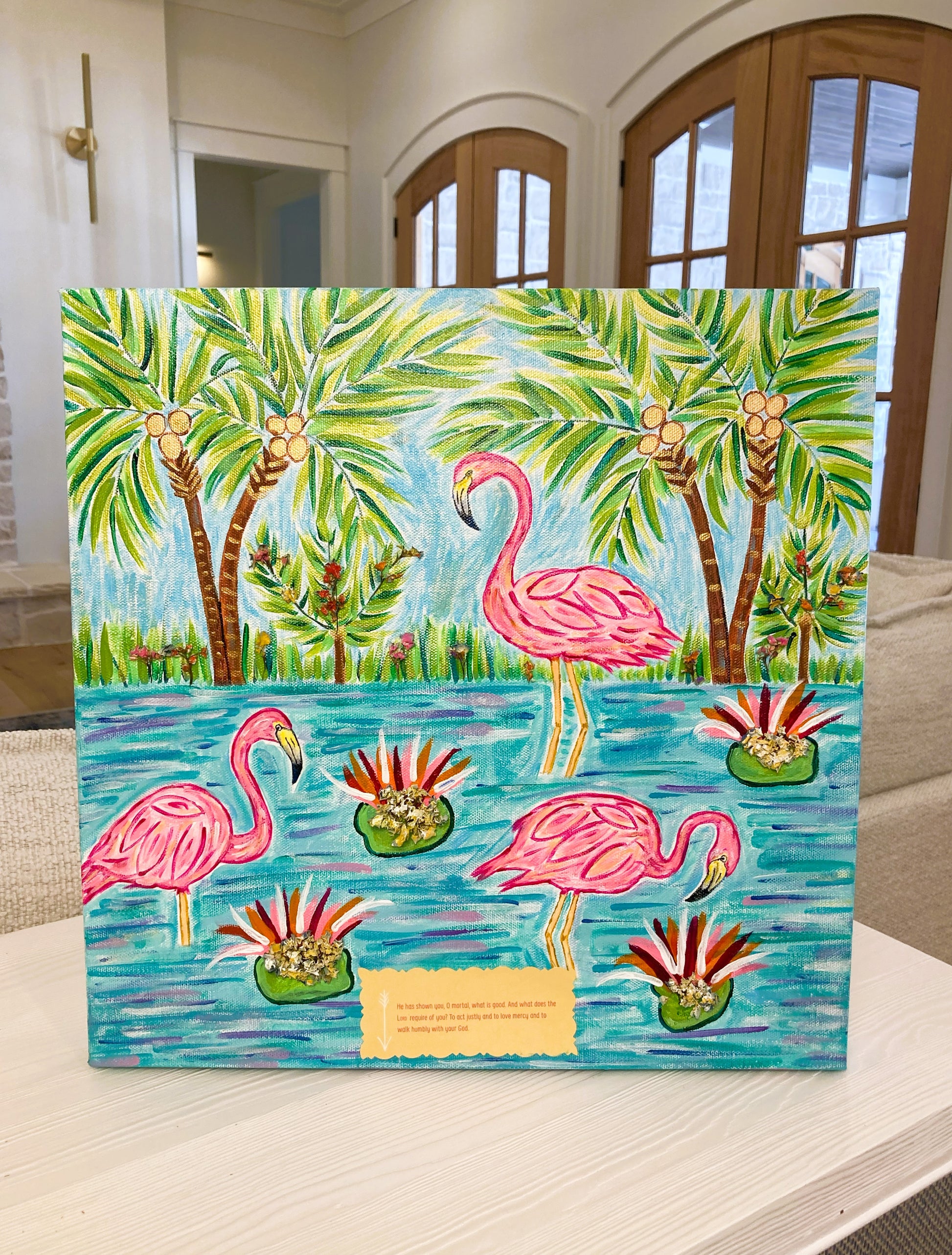Expertly designed "Love Mercy" canvas features a tropical paradise of flamingos, lily pads, and water alongside vibrant palm trees and real flowers. Walk humbly in bright blues, pinks, and greens, while being reminded of the powerful message of Micah 6:8. Made with love and mercy in mind.