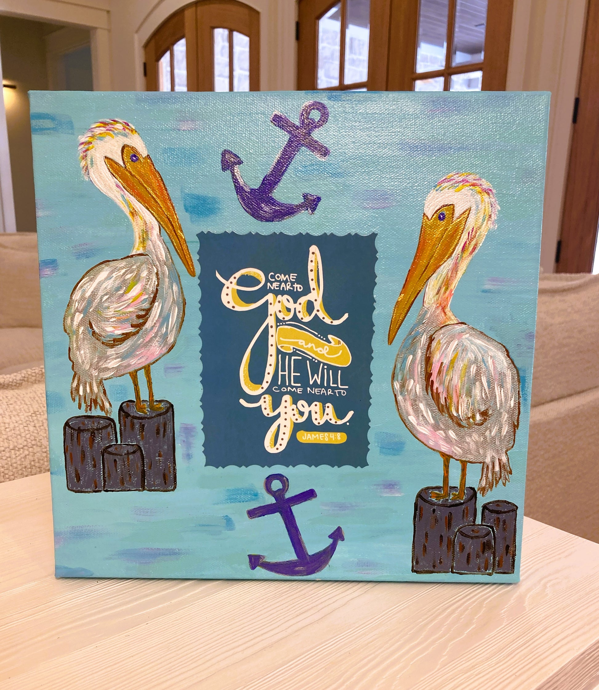 Featuring the majestic pelicans, the calming blue waters, and the symbolic anchors, "Near to God" brings to life James 4:8. Escape to the beach and find peace and solace in the presence of God with this beautiful acrylic art piece.