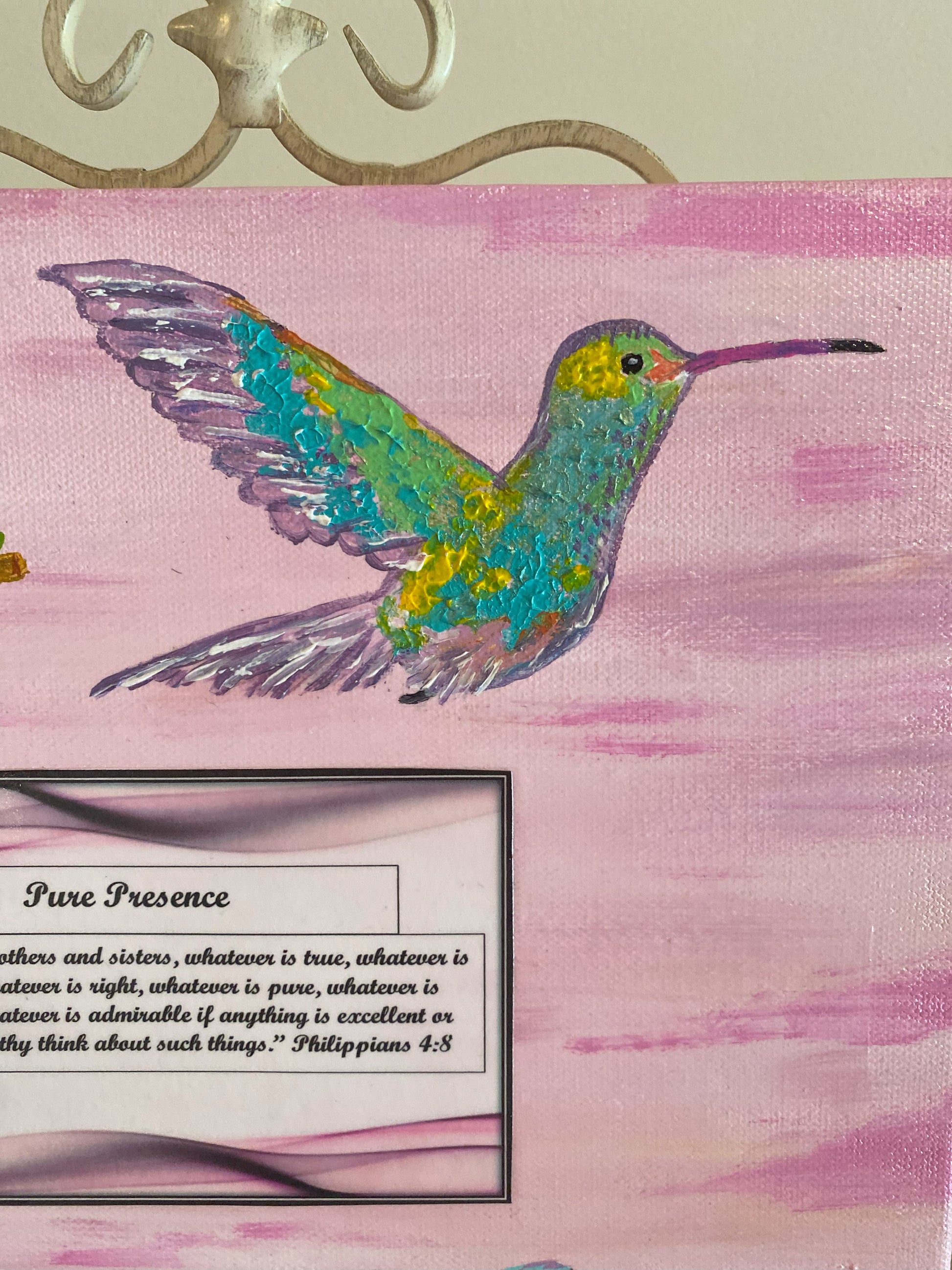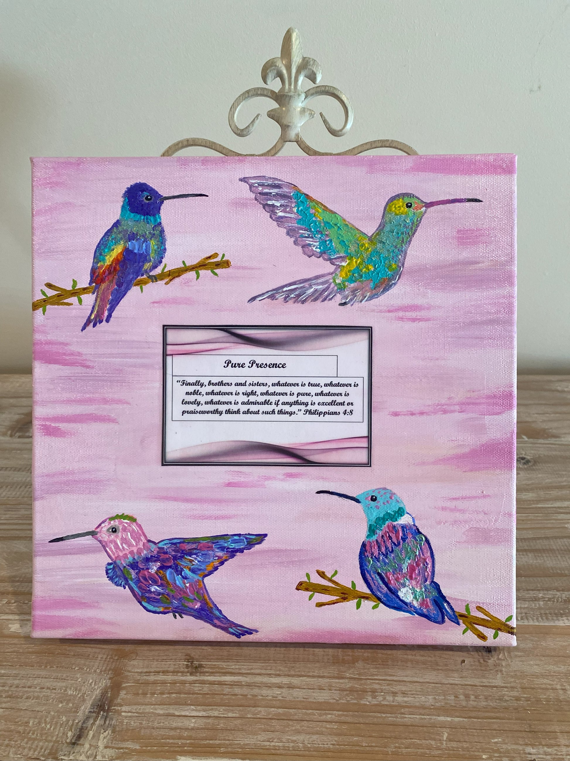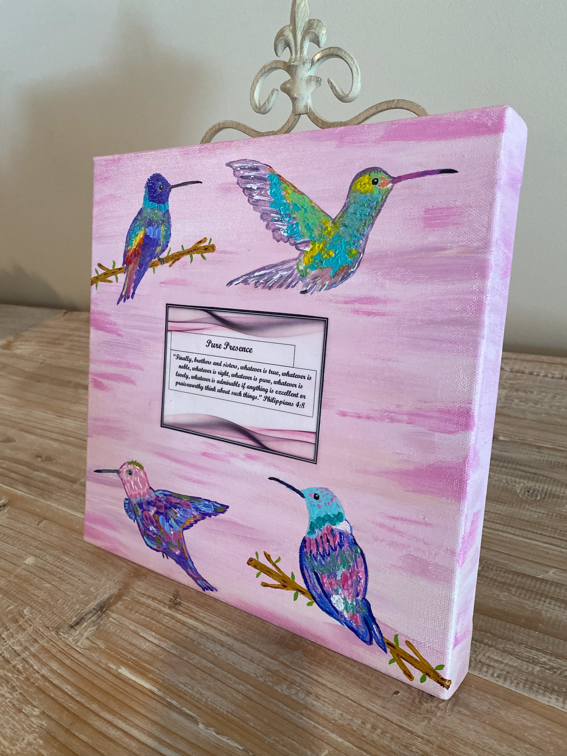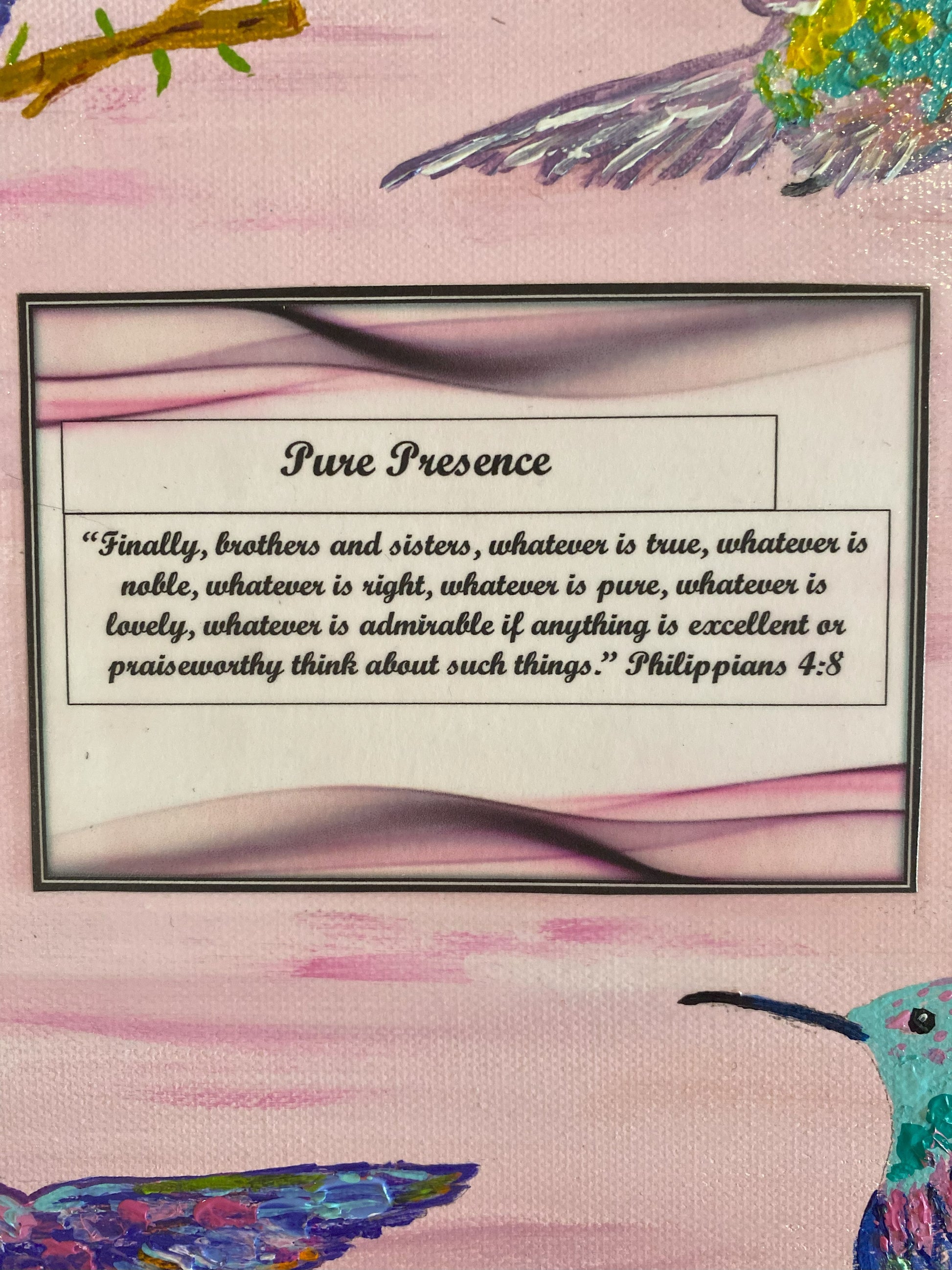 Experience tranquility and peace with "Pure Presence." This unique product features beautiful pink and lavender hues, accompanied by vibrant hummingbirds and symbolic branches. Derived from Philippians 4:8, this is the perfect addition to any space seeking to promote positivity and mindfulness.