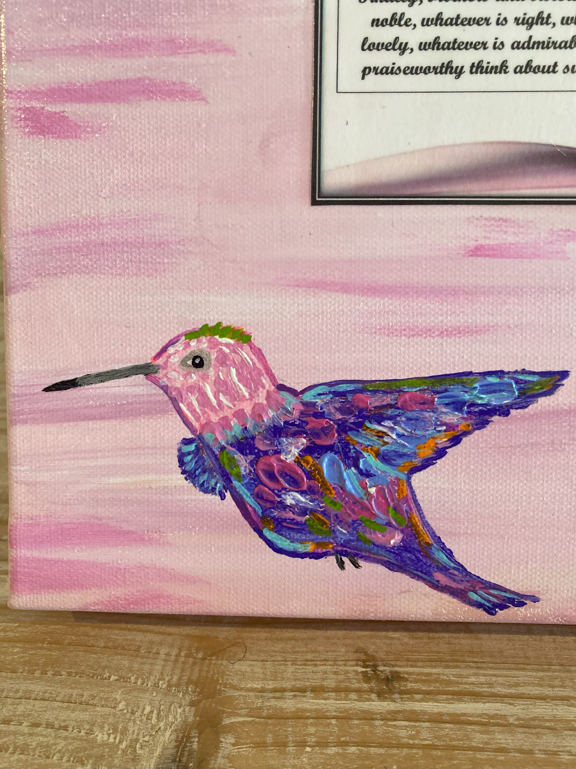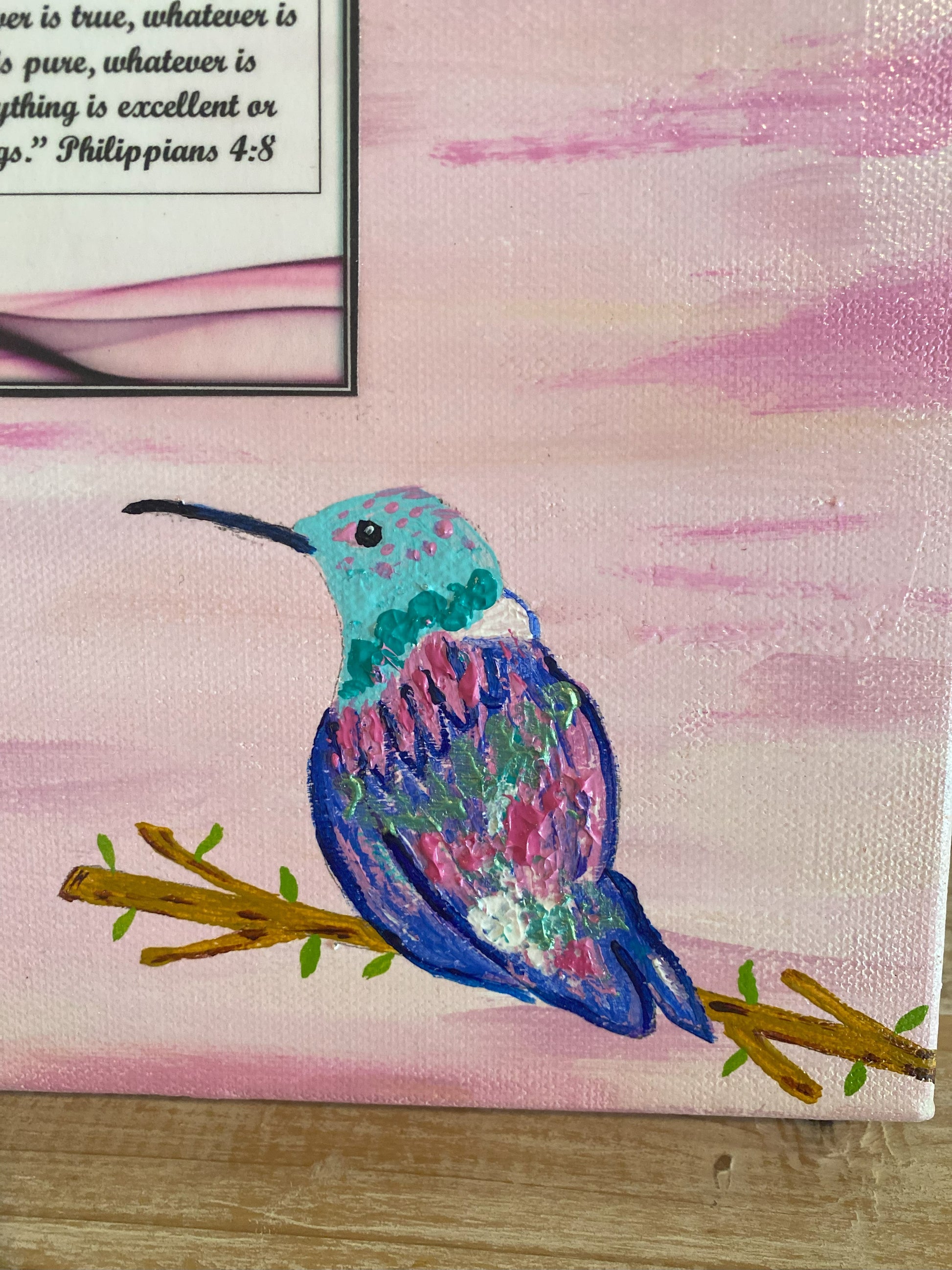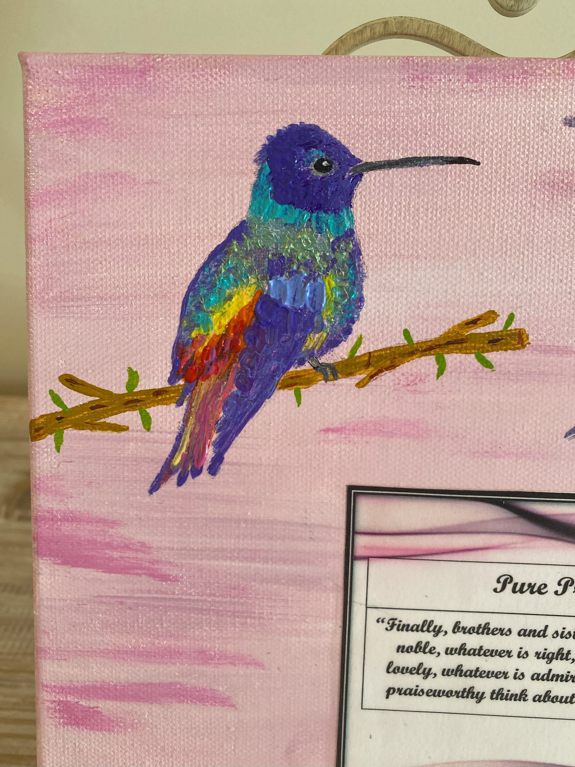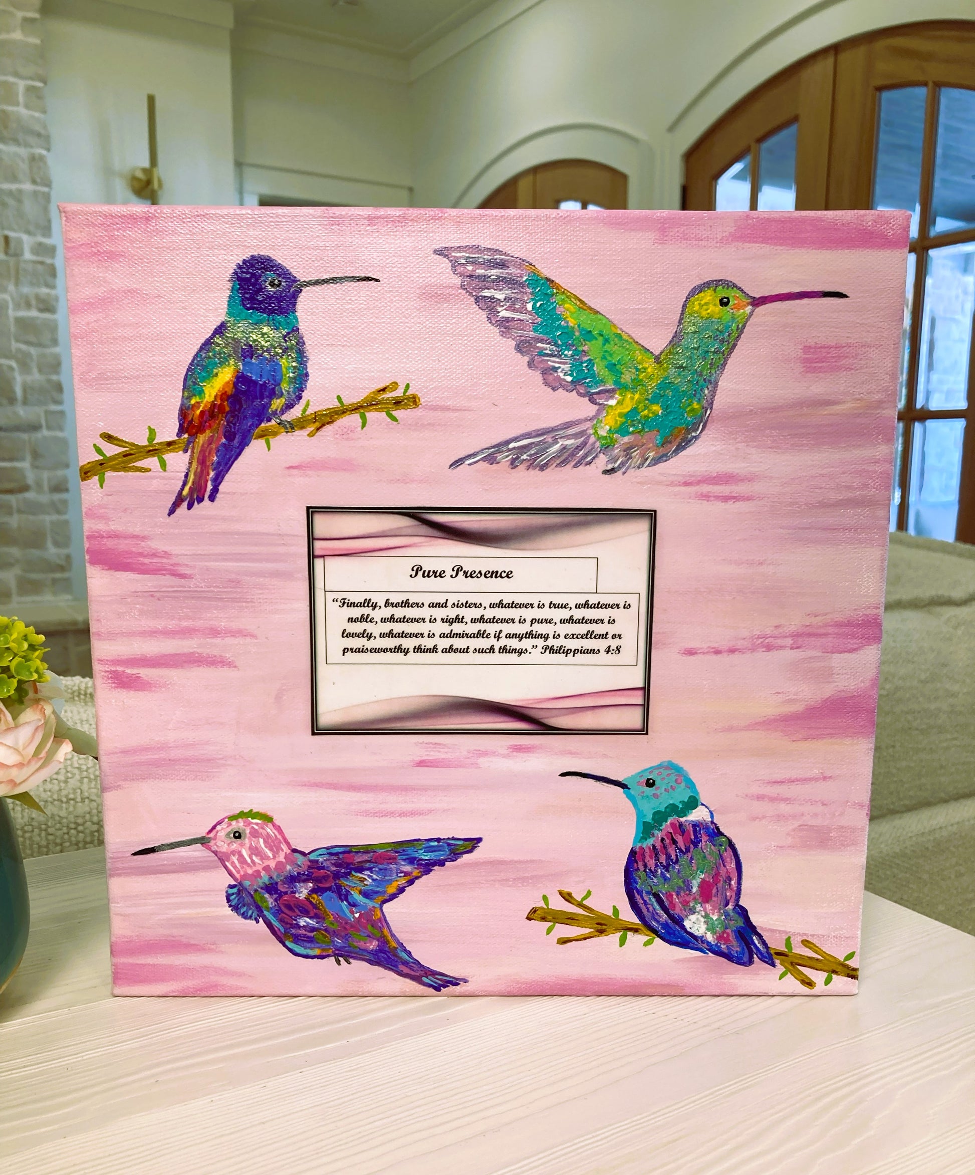 Experience tranquility and peace with "Pure Presence." This unique product features beautiful pink and lavender hues, accompanied by vibrant hummingbirds and symbolic branches. Derived from Philippians 4:8, this is the perfect addition to any space seeking to promote positivity and mindfulness.
