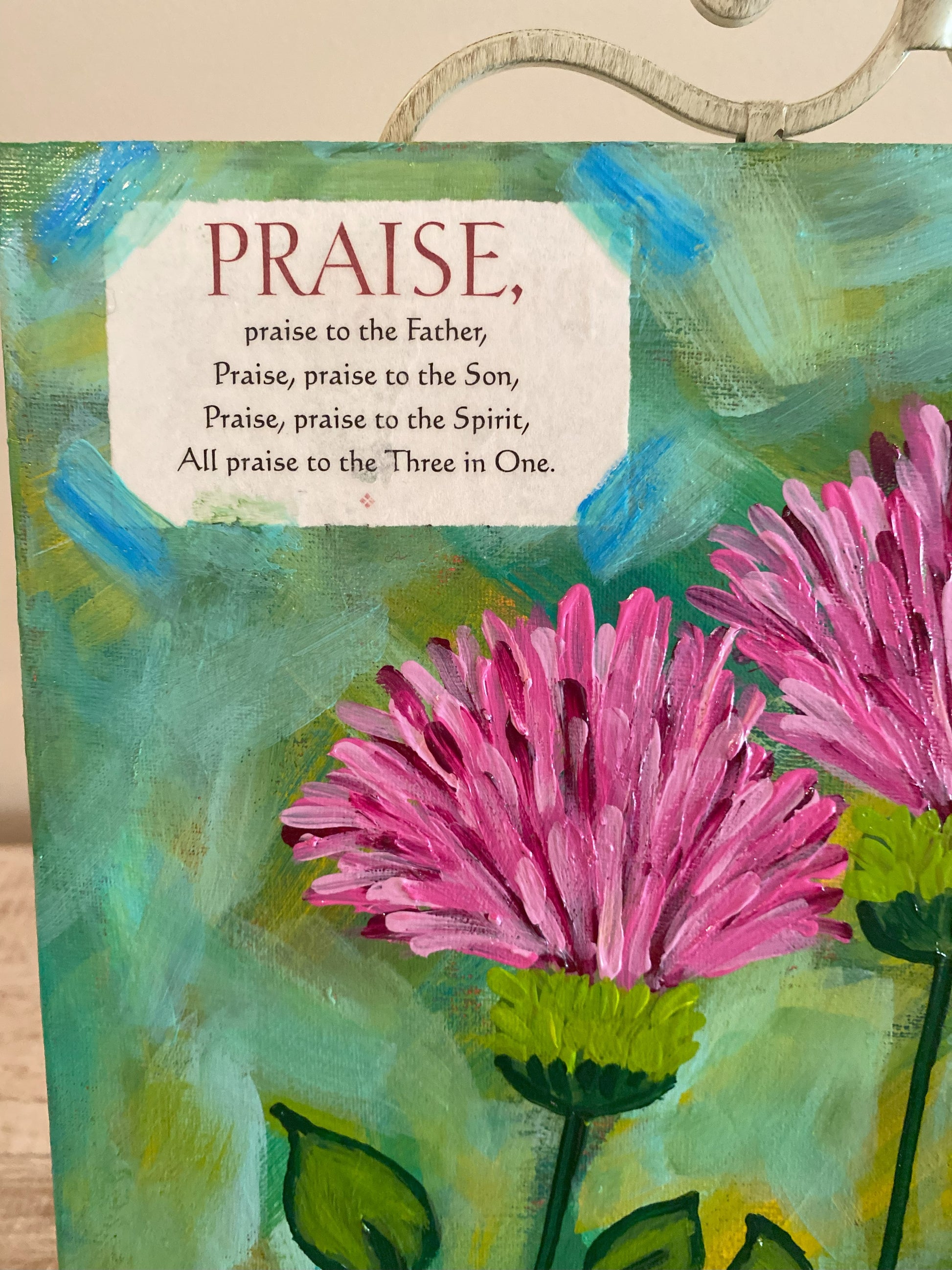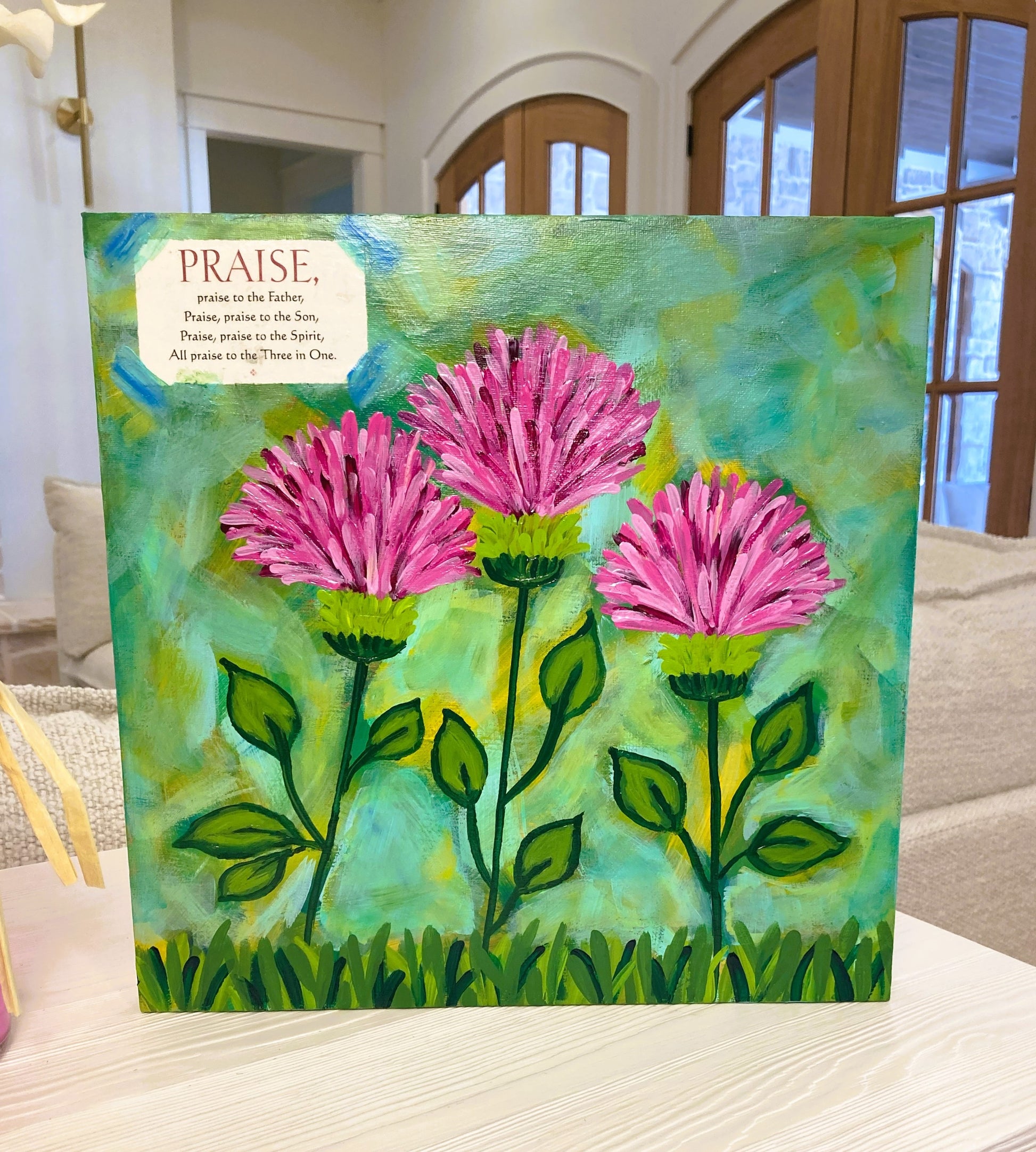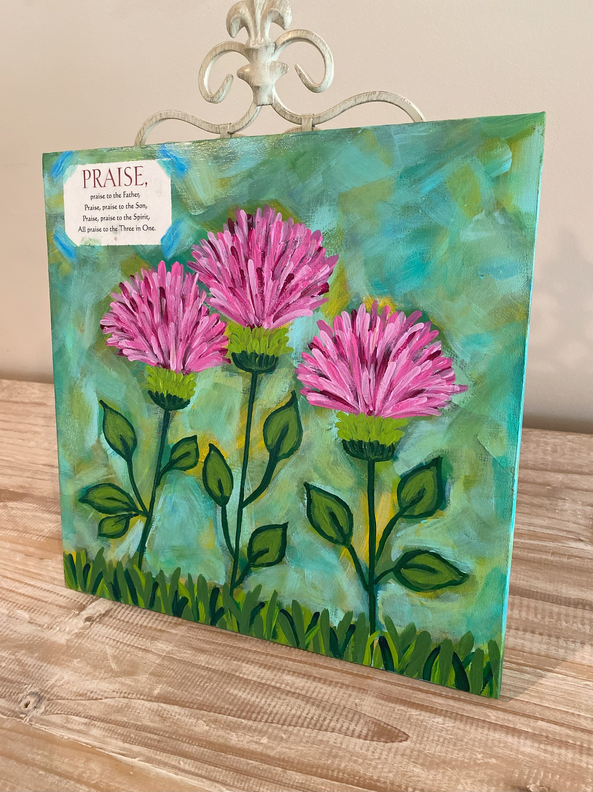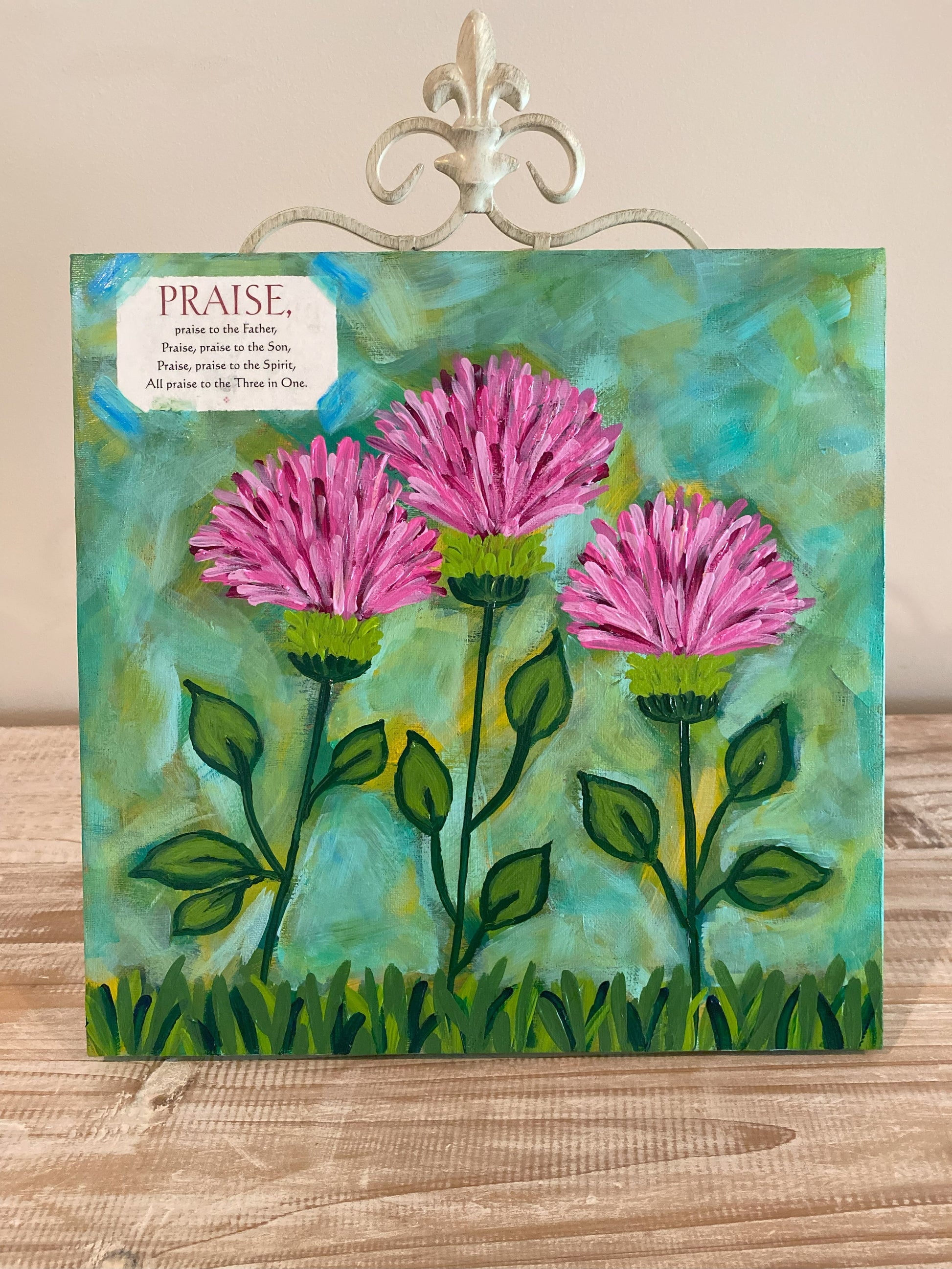 Experience the all-encompassing beauty of "Singing Flowers." This trio, representing Father, Son, and Spirit, bursts with praise in blue, green and tie dye hues. Pink and purple flowers dance on the backdrop, showcasing the harmony of these three in one. An expression of faith and love in every bloom.