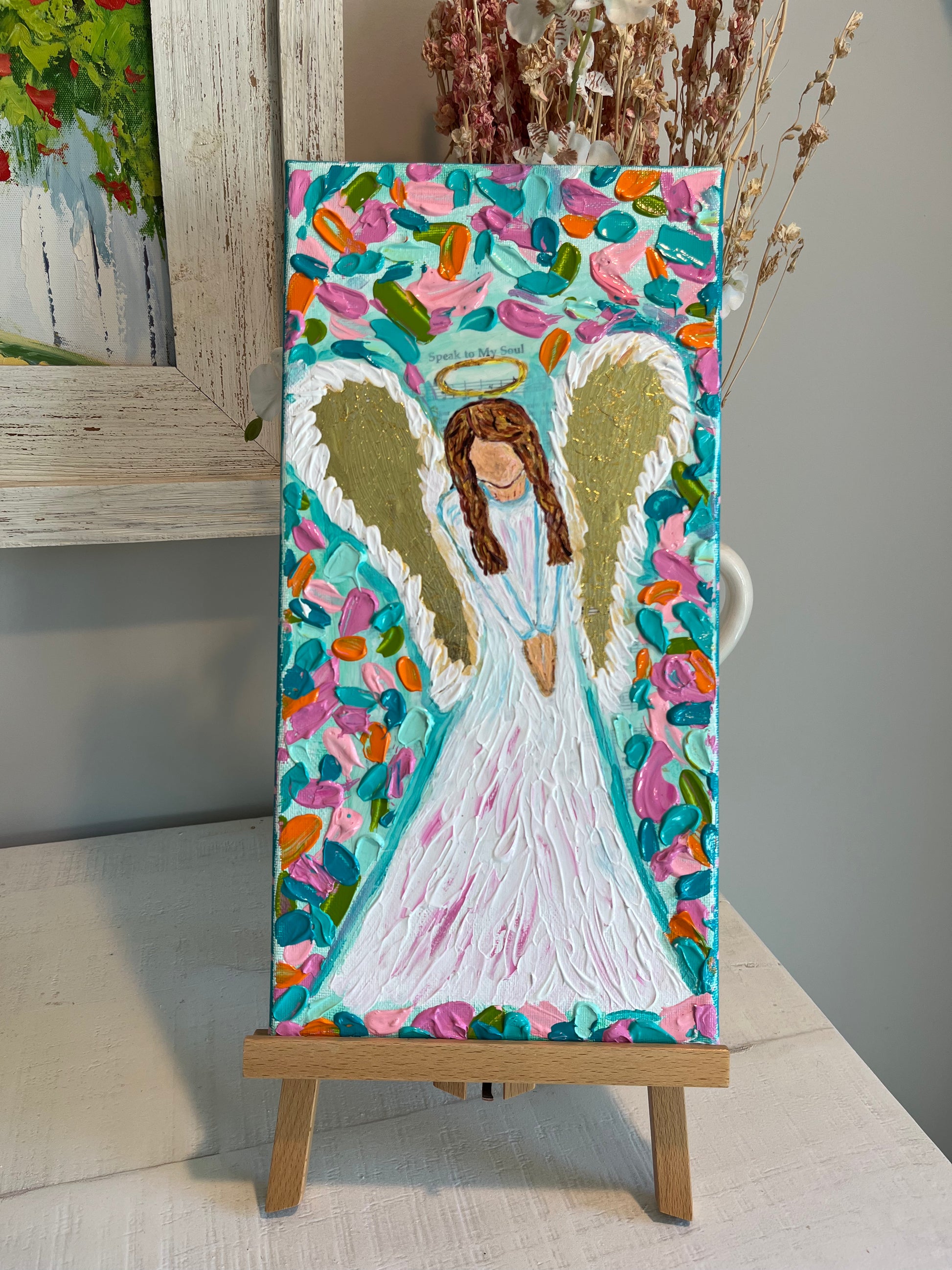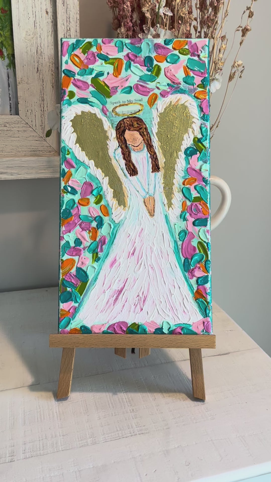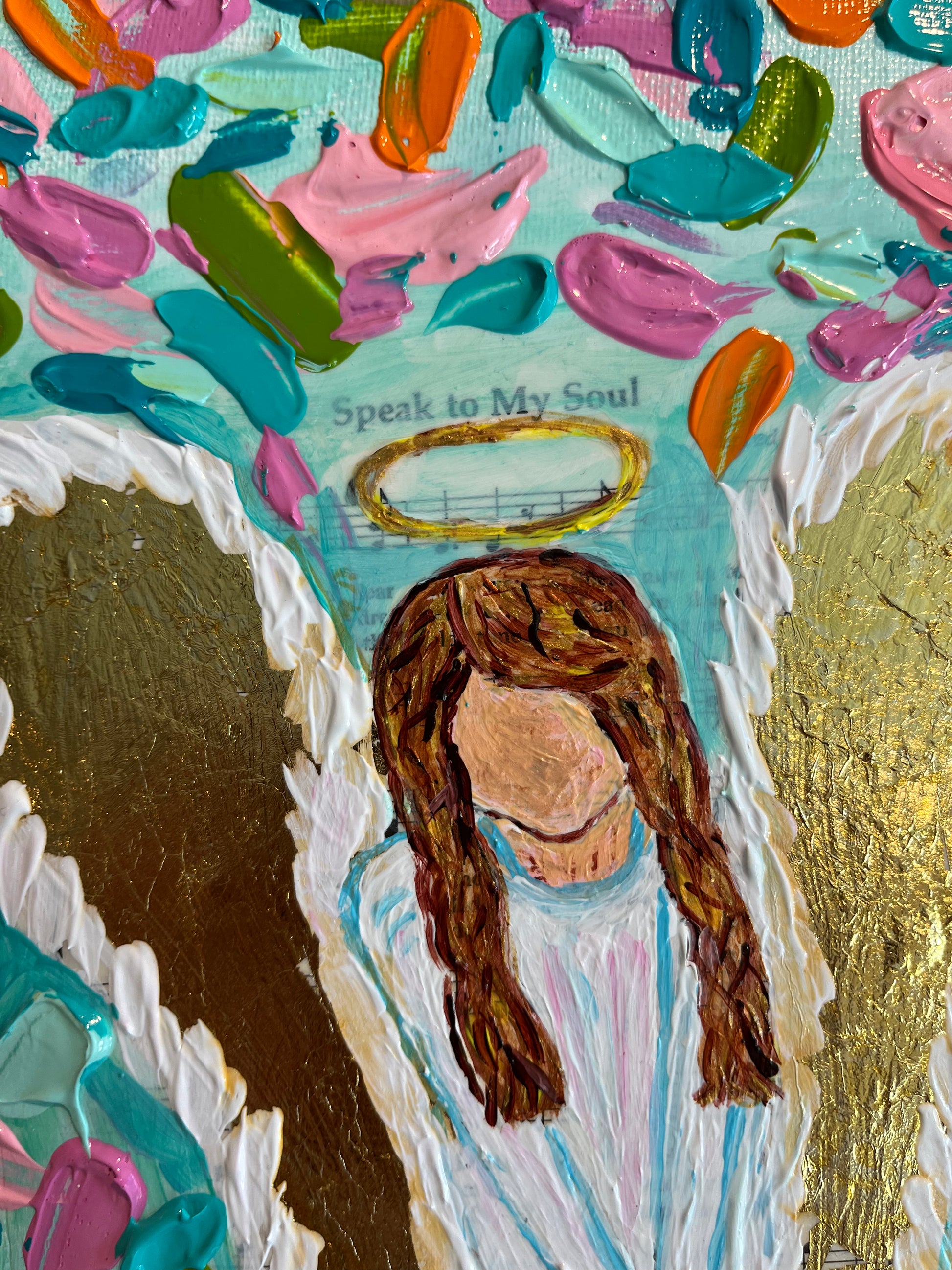"Speak to My Soul" is a captivating mixed media acrylic painting that blends ethereal angelic imagery with the textured vibrancy of bubble paint and shimmering gold accents. This hymnal-inspired artwork invites a profound spiritual connection, offering both visual depth and a luminous presence. Its intricate layering and expert technique make it a distinguished piece for collectors seeking meaningful, contemplative art.