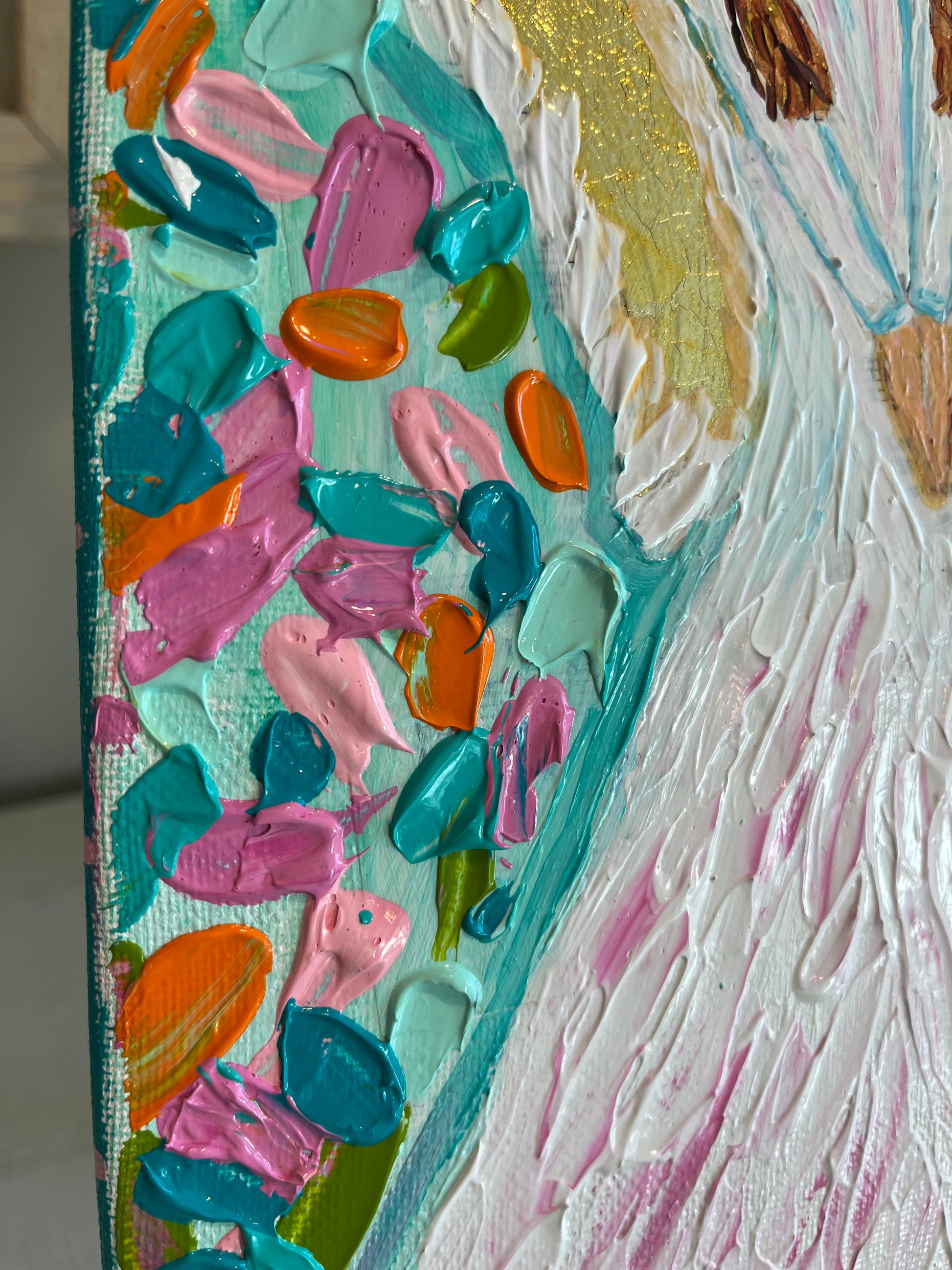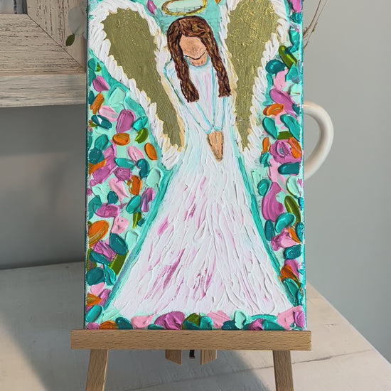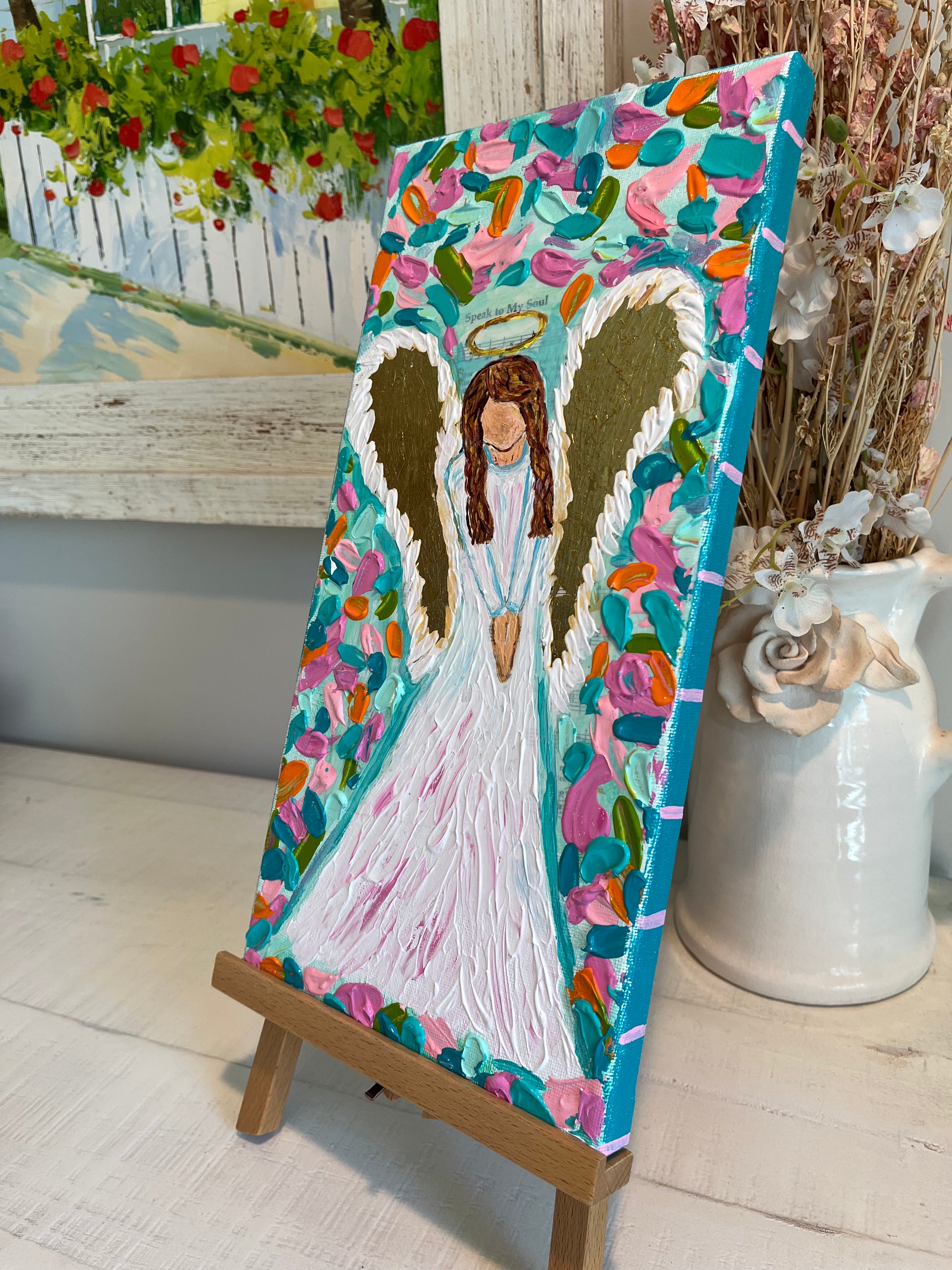 "Speak to My Soul" is a captivating mixed media acrylic painting that blends ethereal angelic imagery with the textured vibrancy of bubble paint and shimmering gold accents. This hymnal-inspired artwork invites a profound spiritual connection, offering both visual depth and a luminous presence. Its intricate layering and expert technique make it a distinguished piece for collectors seeking meaningful, contemplative art.