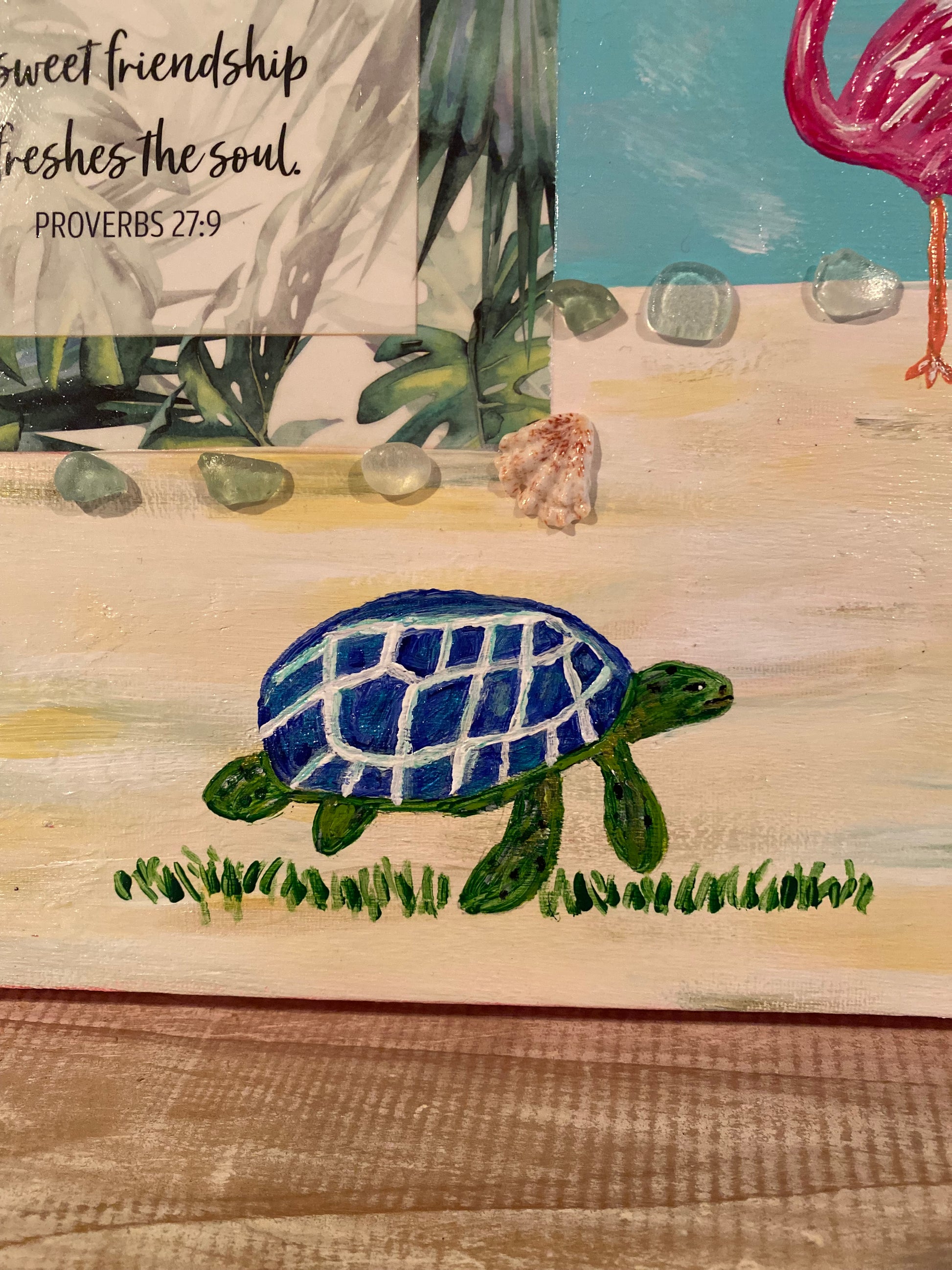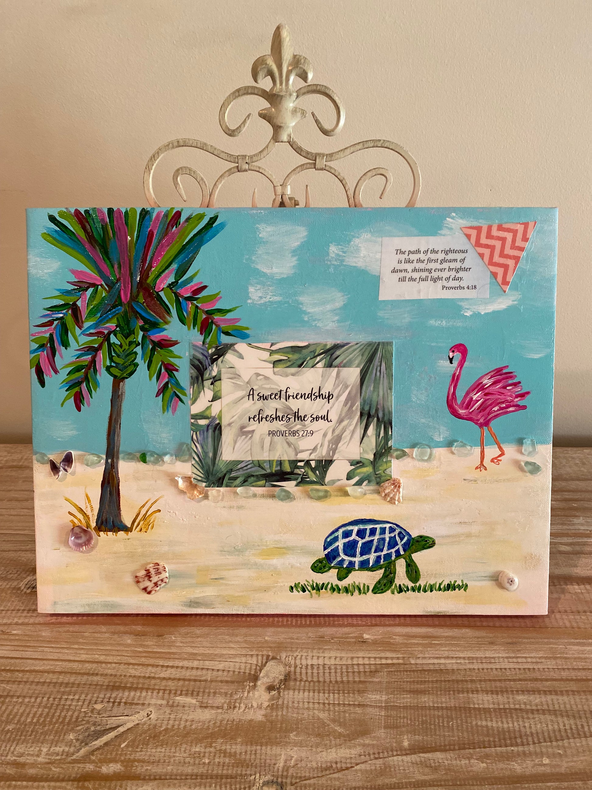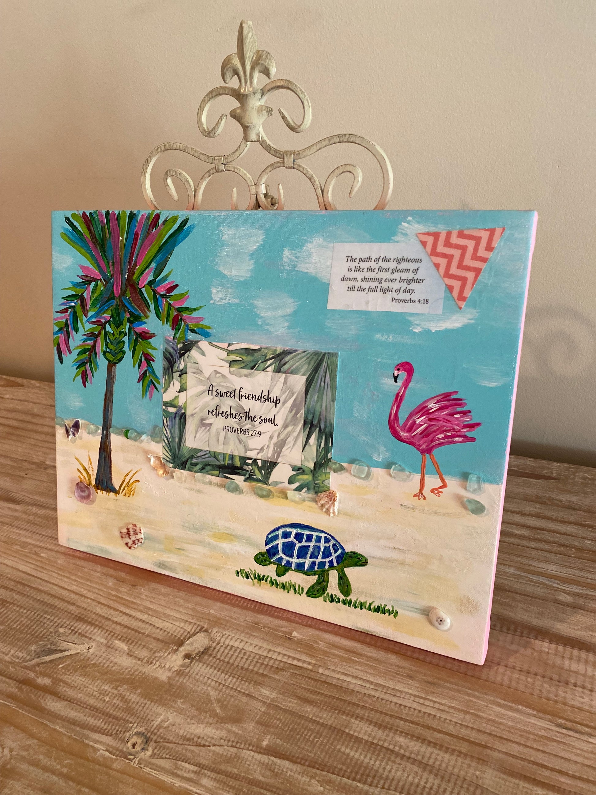 Discover a path to righteousness with "Sweet Friendship." Let Proverbs 4:18 guide you towards a life full of light and brighter days. This acrylic painting includes beach-themed items like a palm tree, turtle, flamingo, and real shells and sea glass to refresh your soul.