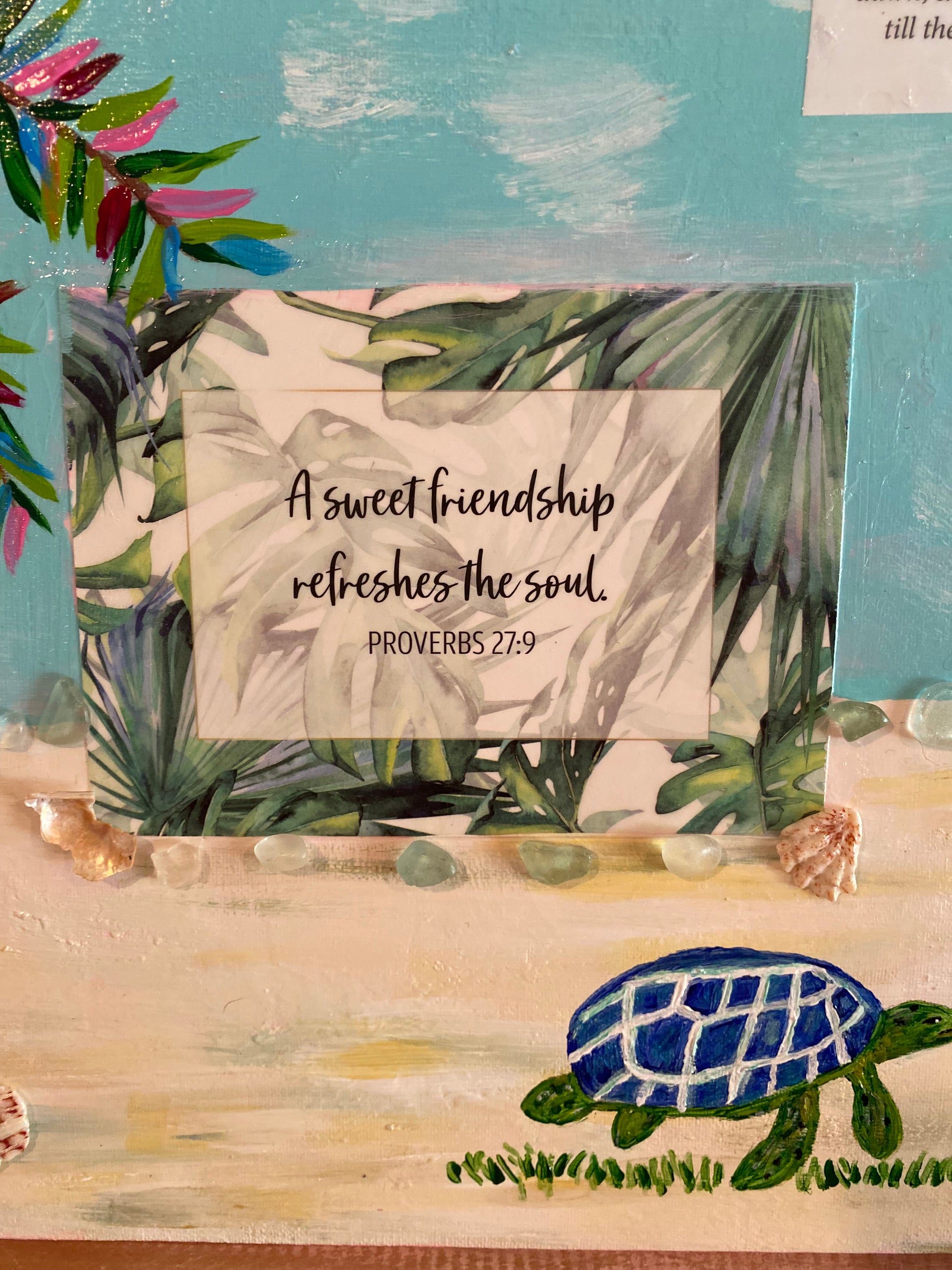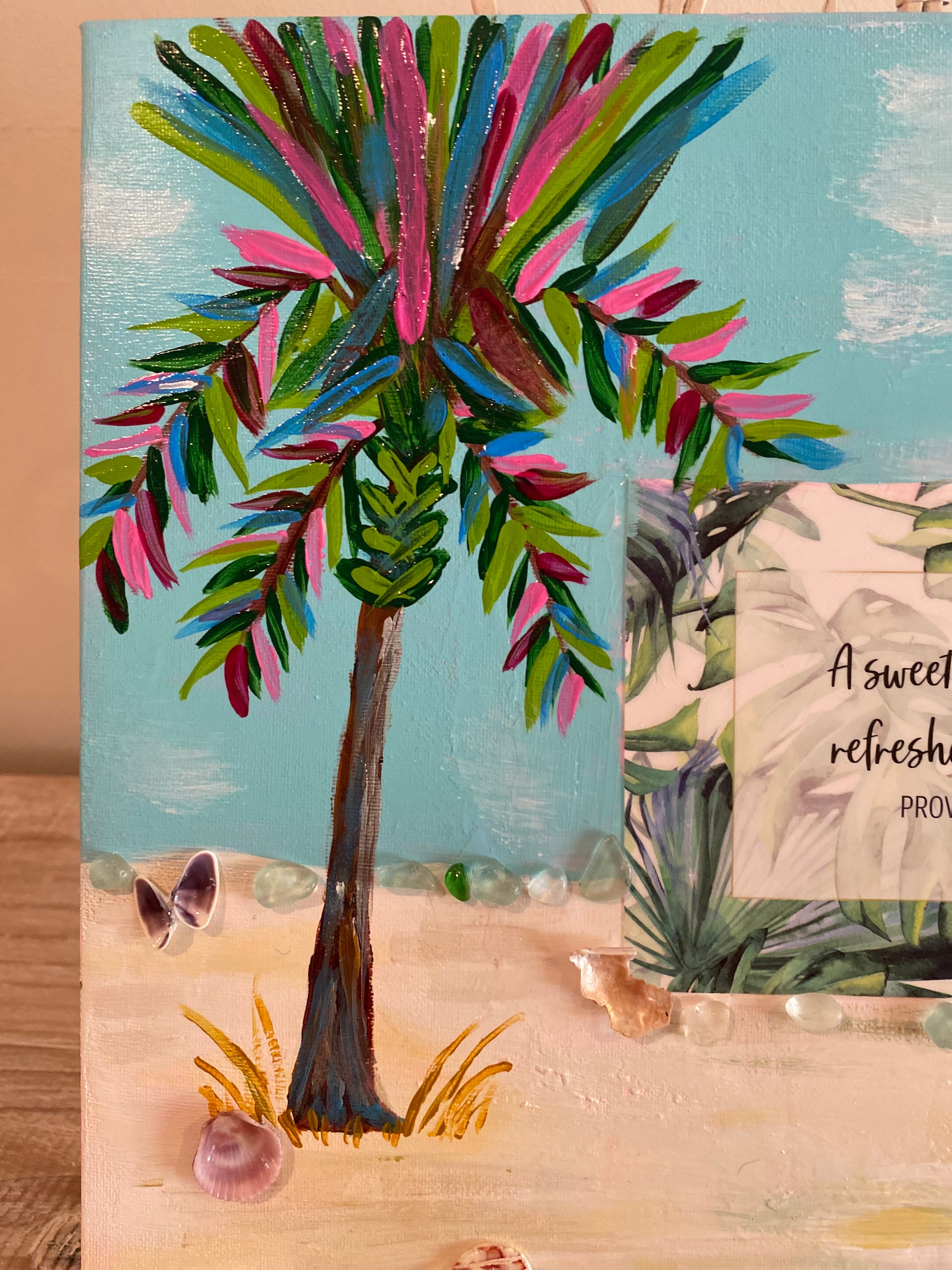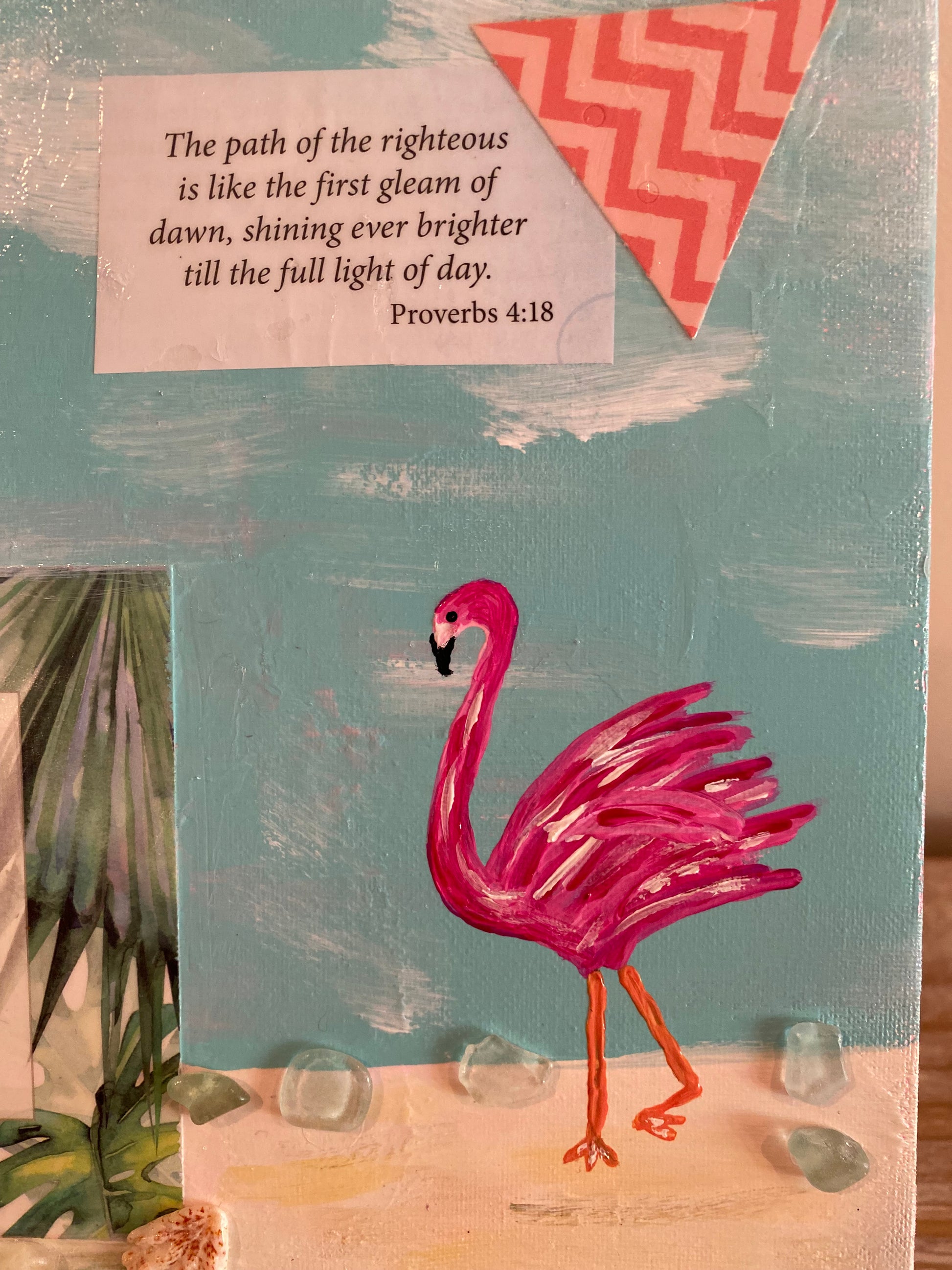 Discover a path to righteousness with "Sweet Friendship." Let Proverbs 4:18 guide you towards a life full of light and brighter days. This acrylic painting includes beach-themed items like a palm tree, turtle, flamingo, and real shells and sea glass to refresh your soul.