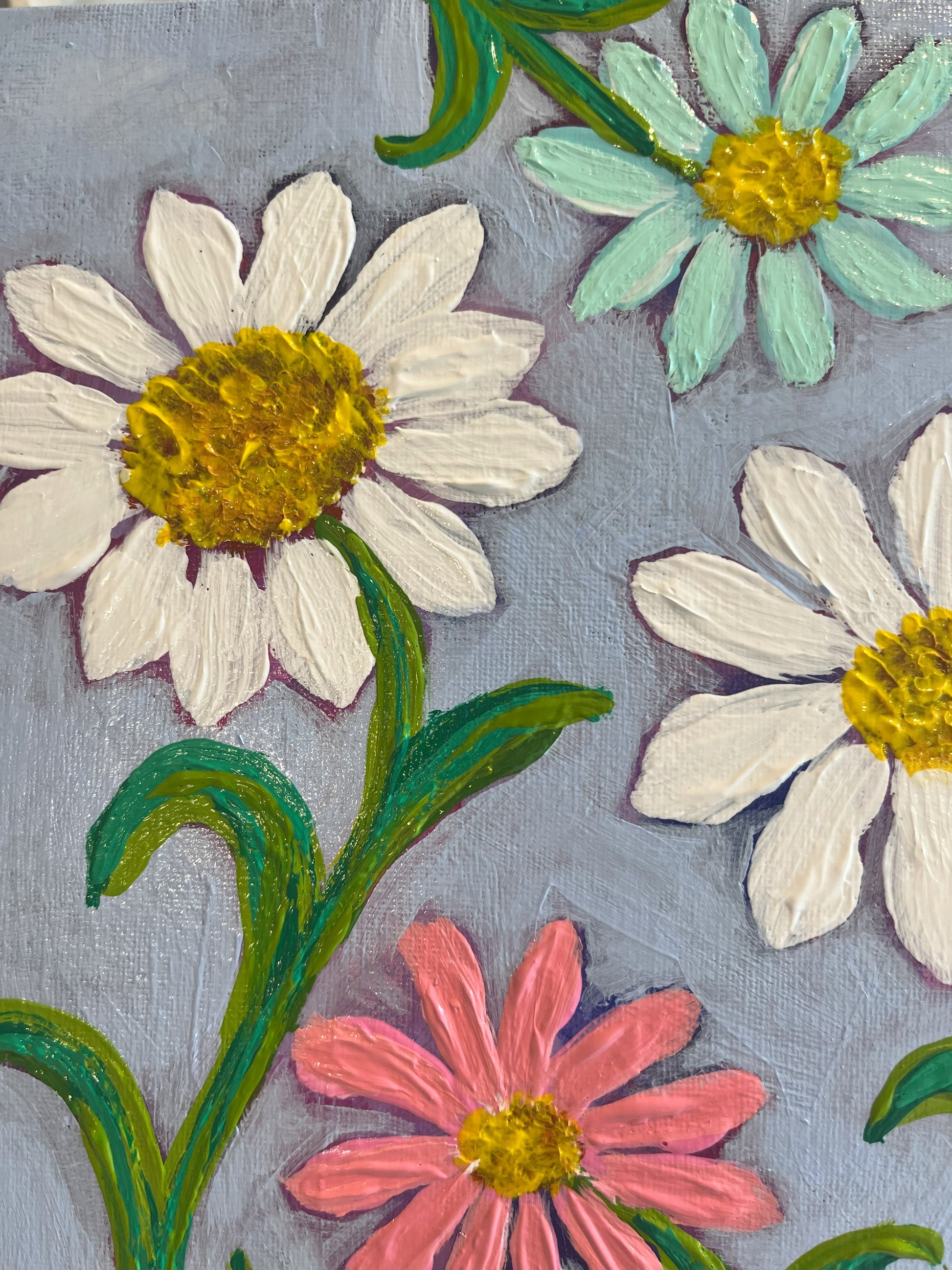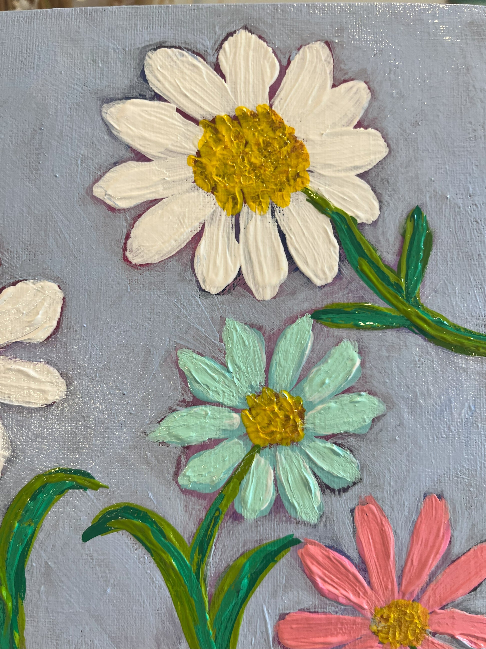 12" x 12" original acrylic painting on hearty weight-bearing canvas. Sealed with a clear coat of high gloss spray paint.