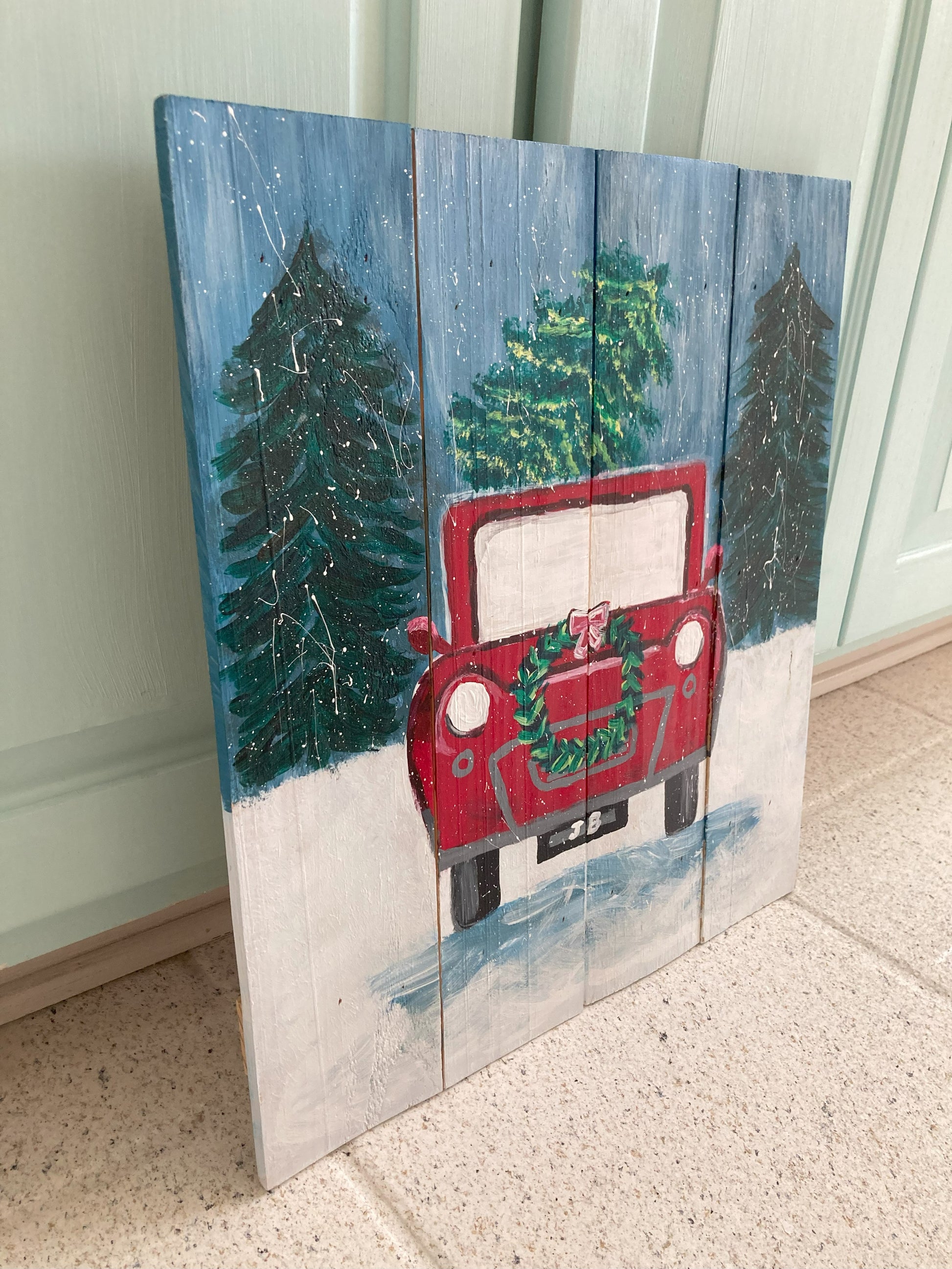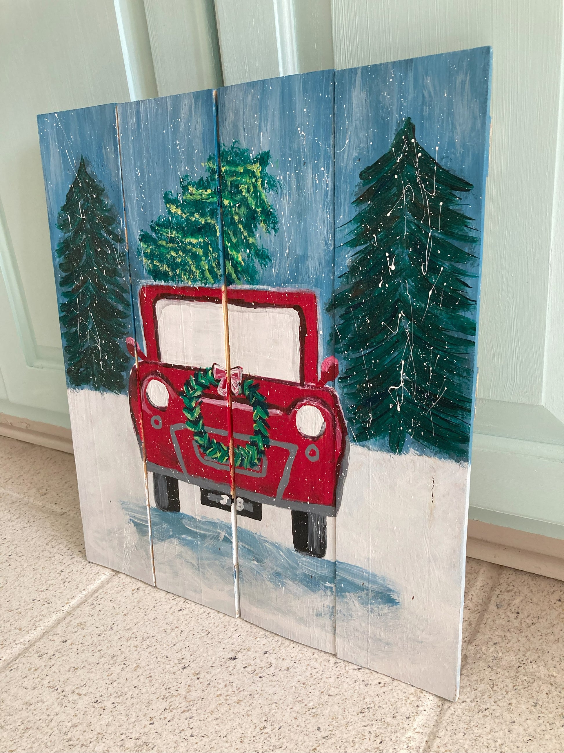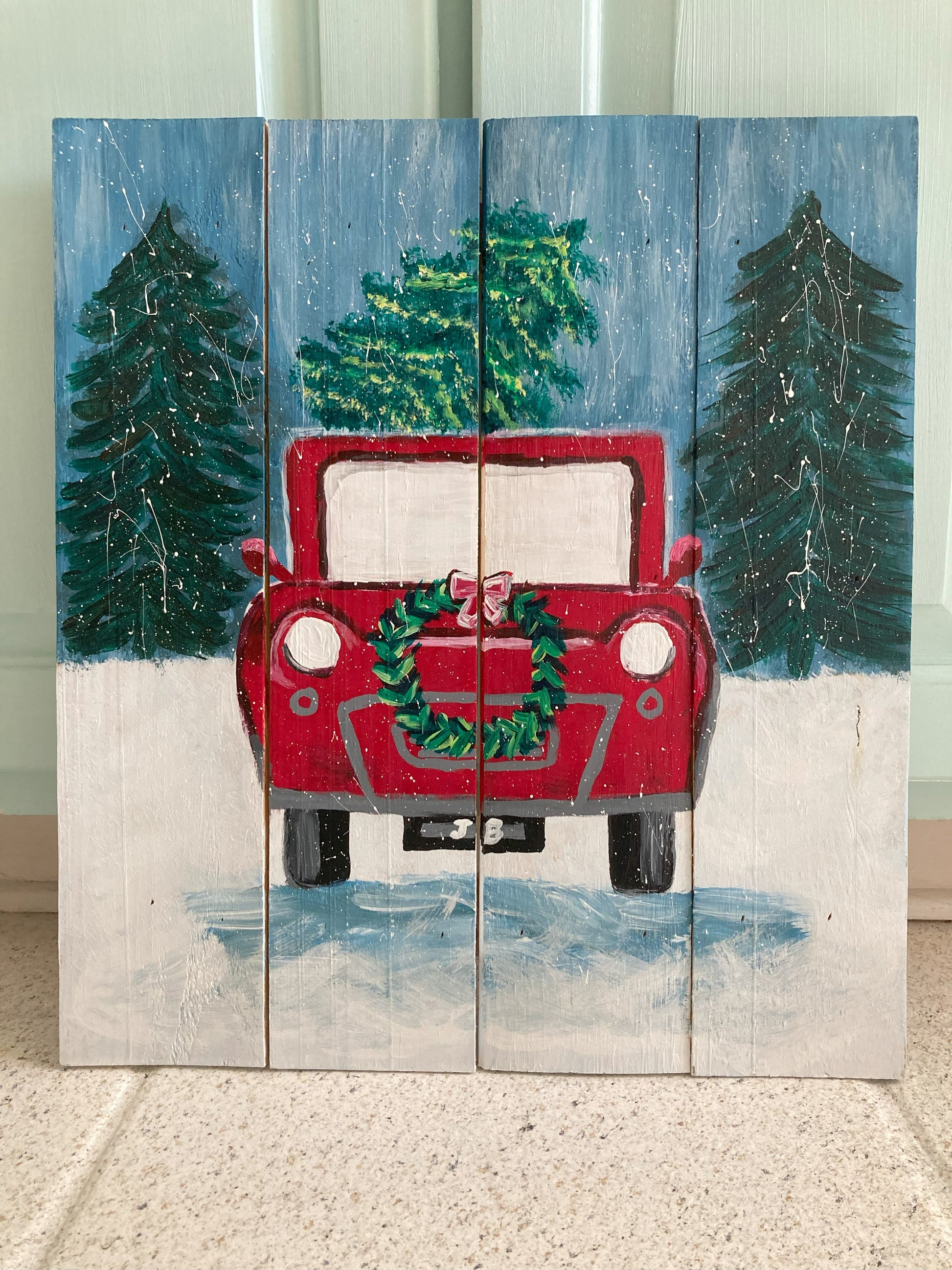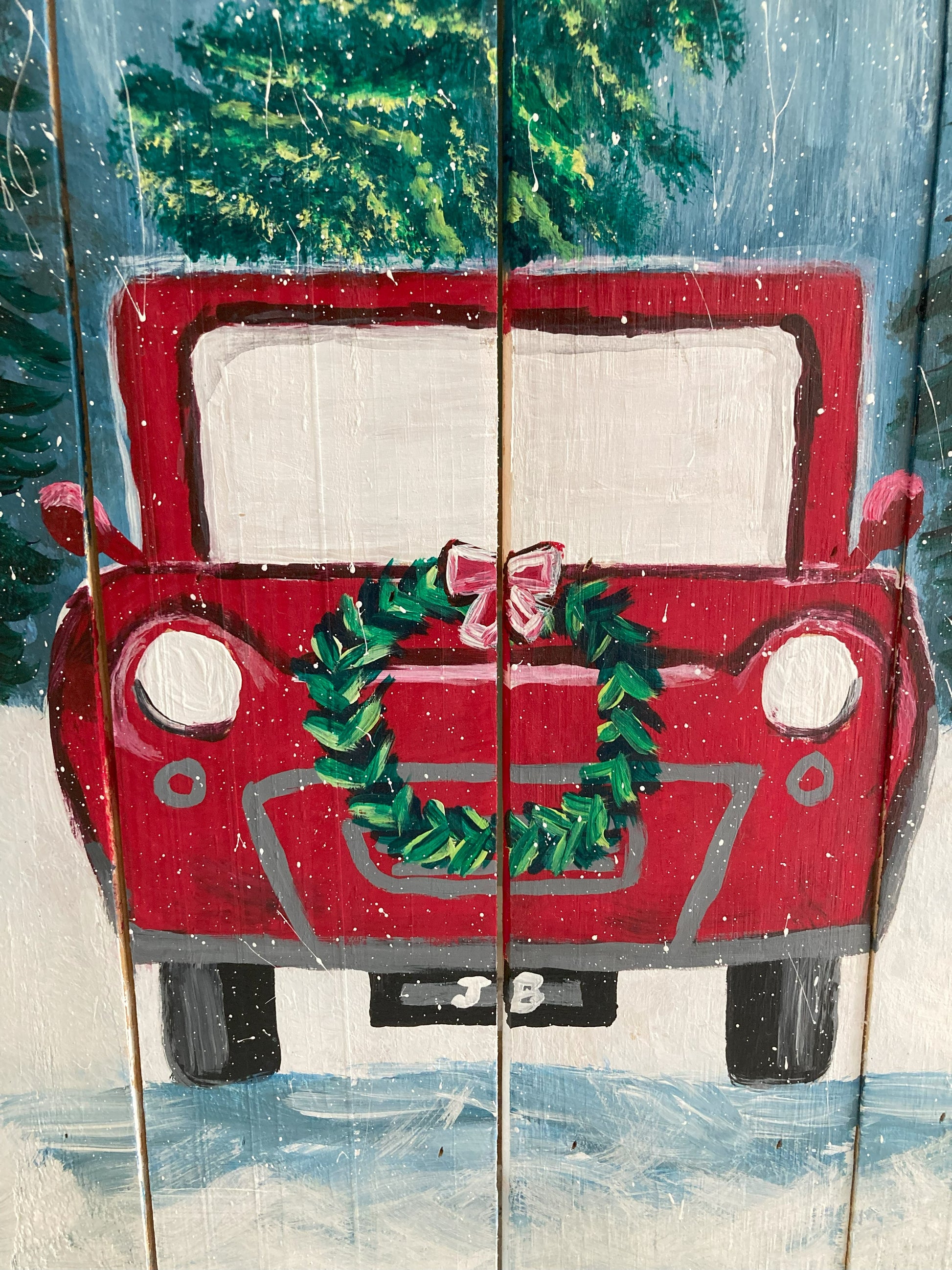 Painting in listing is an example of "Winter Wonderland" acrylic painted wood art. I will create a replica of this beautiful painting for your home. Personalized initials will be included on the truck's license plate. The perfect gift for your friend or family member for Christmas. These acrylic paintings will be on pine wood that my husband has made from scratch. The size of the painting is 17' in height and 15.5' in length. You can customize your painting as you wish as this is by commission only. (Will included FREE wall hanging kit upon request only.) Please email me at cocojael.us@gmail.com with details for your painting after purchase.