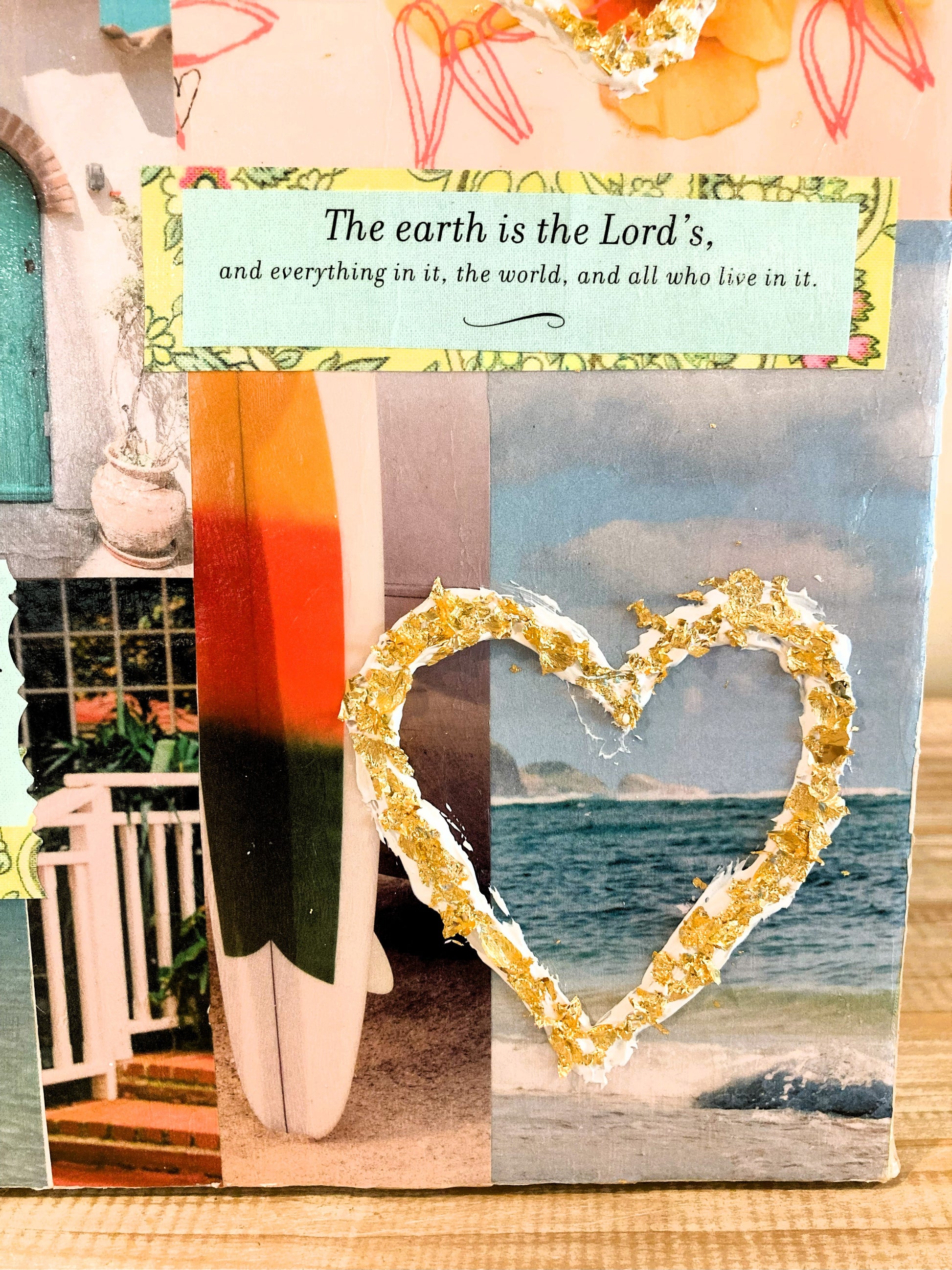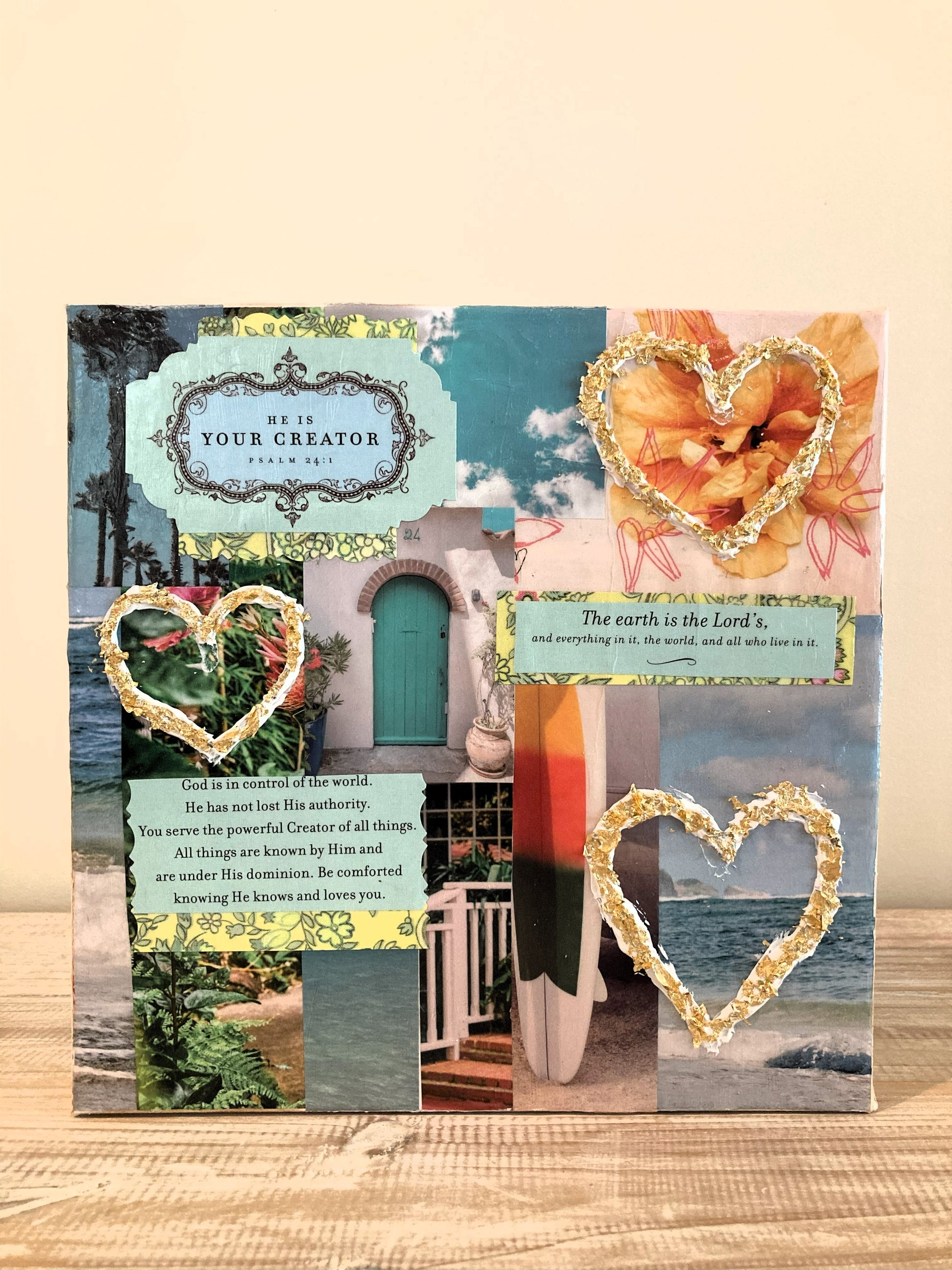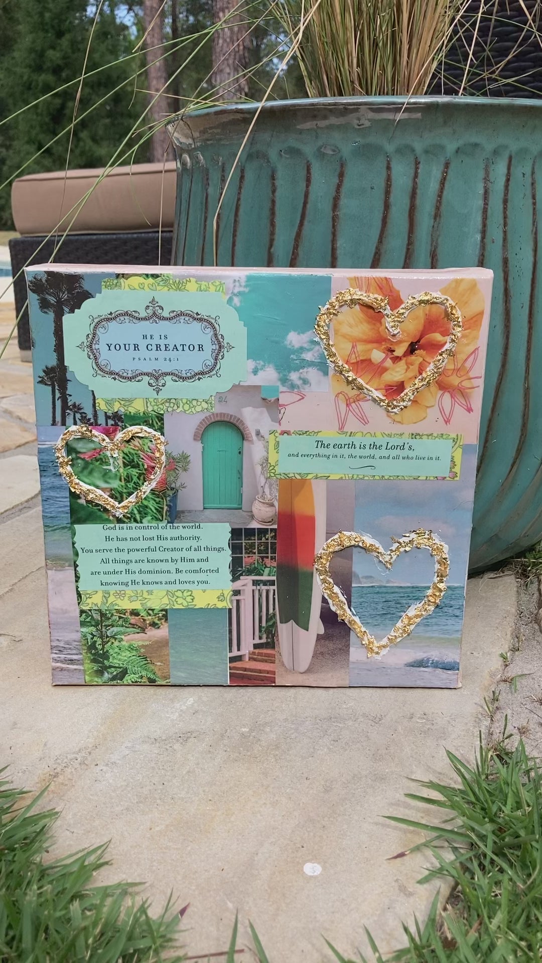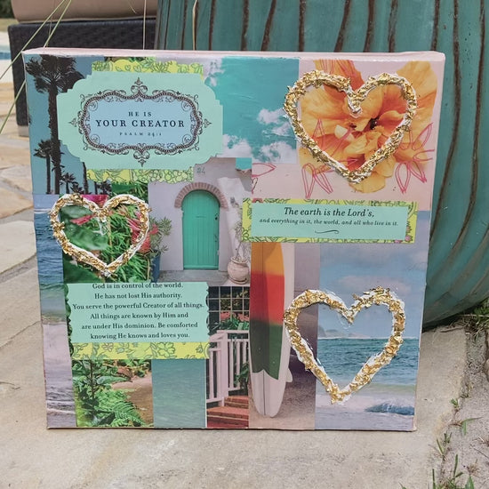 "Your Creator" is a unique piece of mixed media artwork featuring beautiful tropical elements and a rose gold border. The centerpiece is a meaningful Psalm 24:1 quote, accented with gold fleck hearts. Perfect for adding a touch of inspiration and elegance to any space.