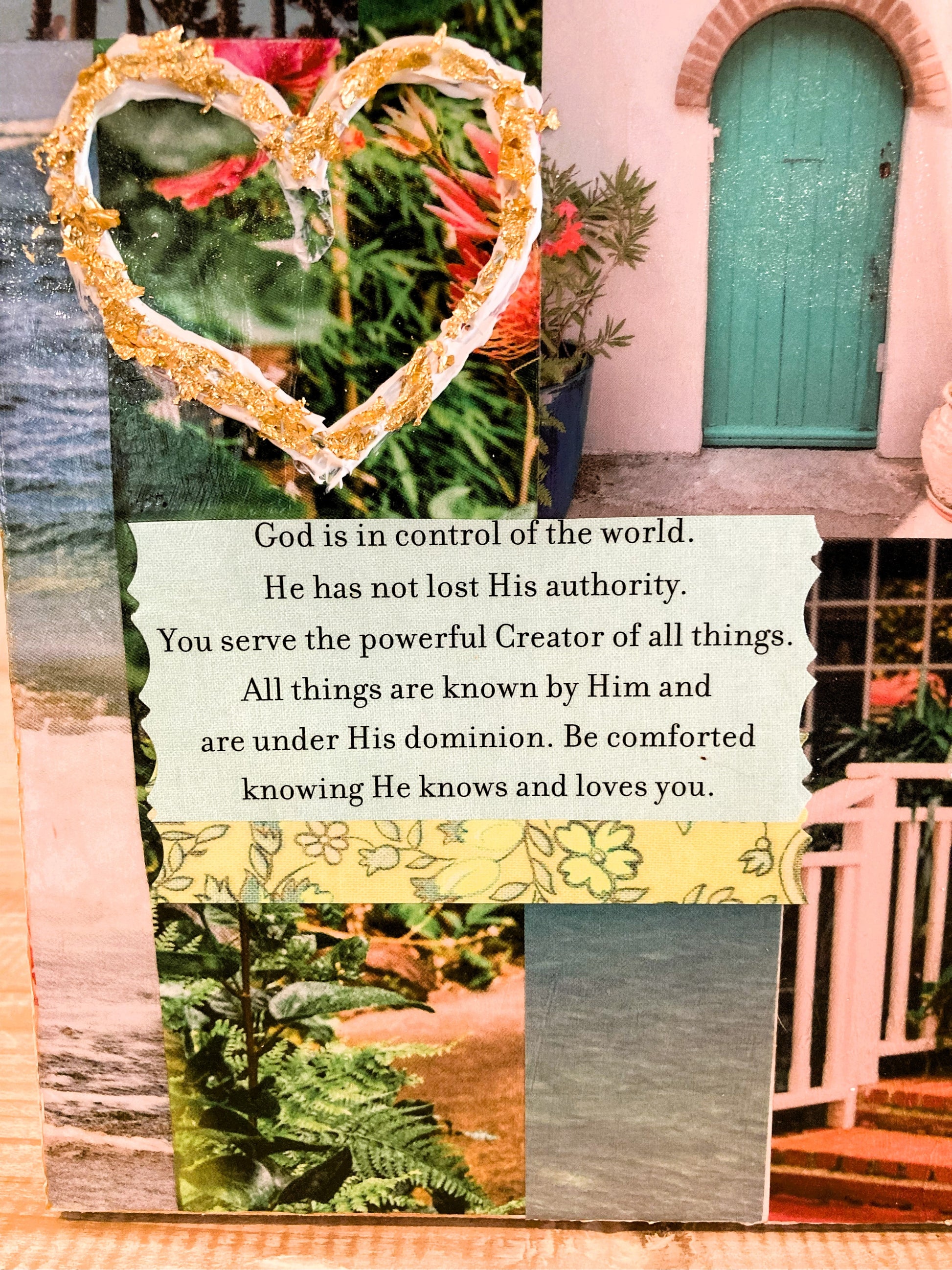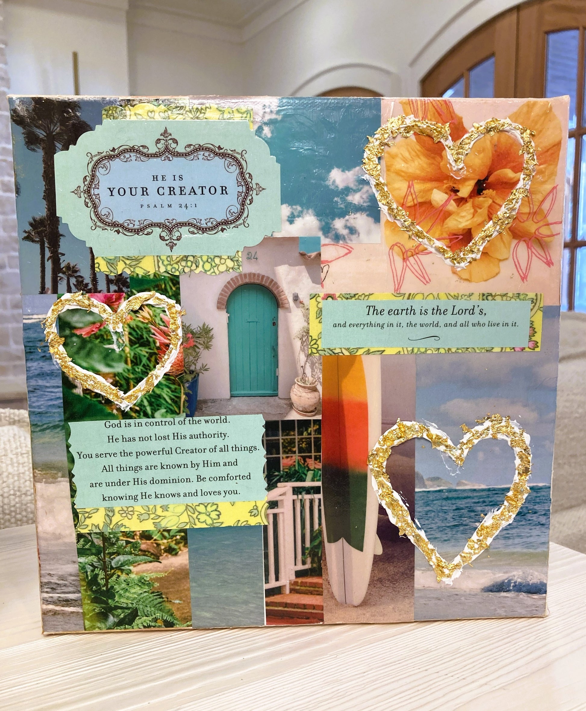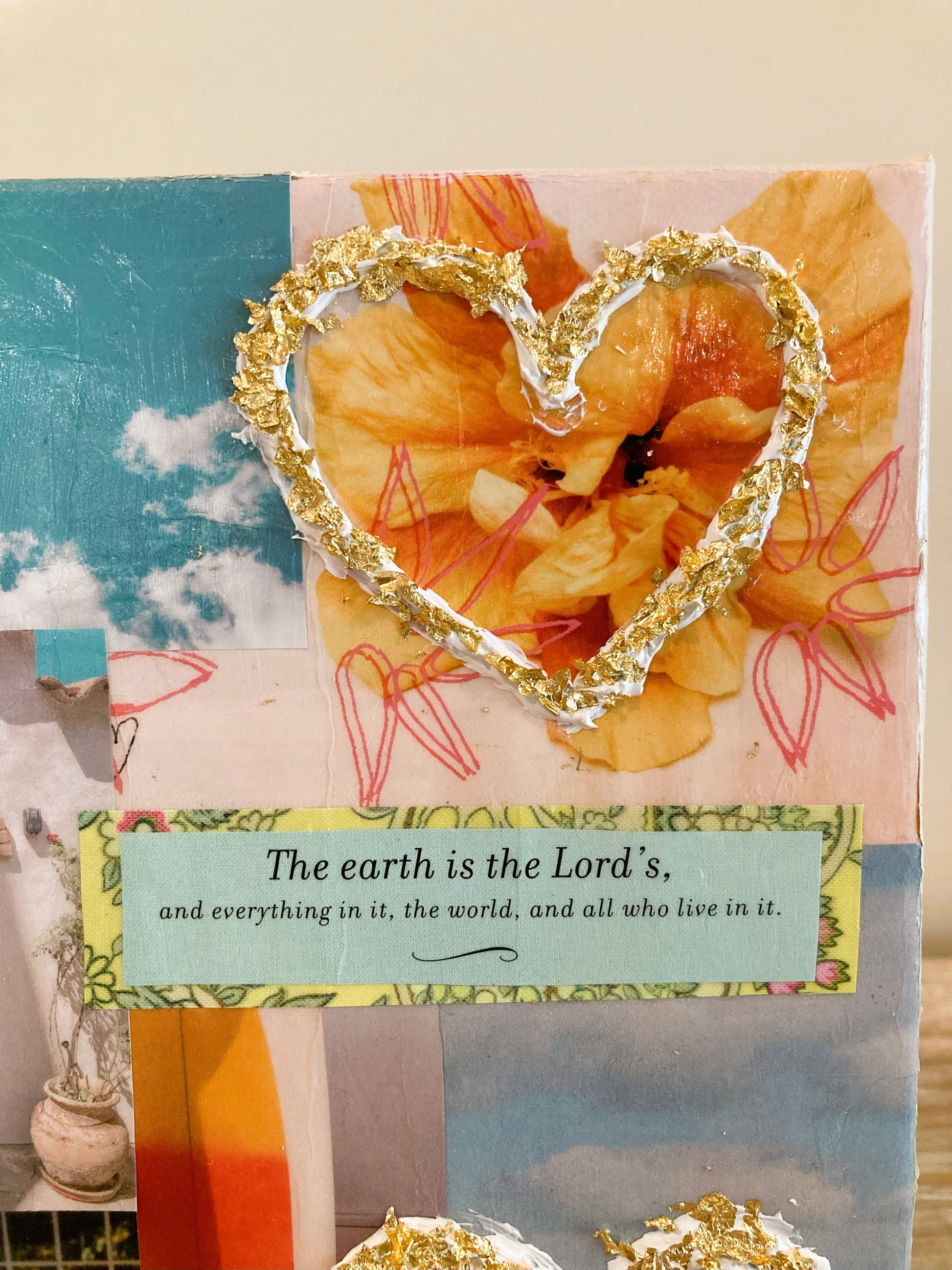 "Your Creator" is a unique piece of mixed media artwork featuring beautiful tropical elements and a rose gold border. The centerpiece is a meaningful Psalm 24:1 quote, accented with gold fleck hearts. Perfect for adding a touch of inspiration and elegance to any space.