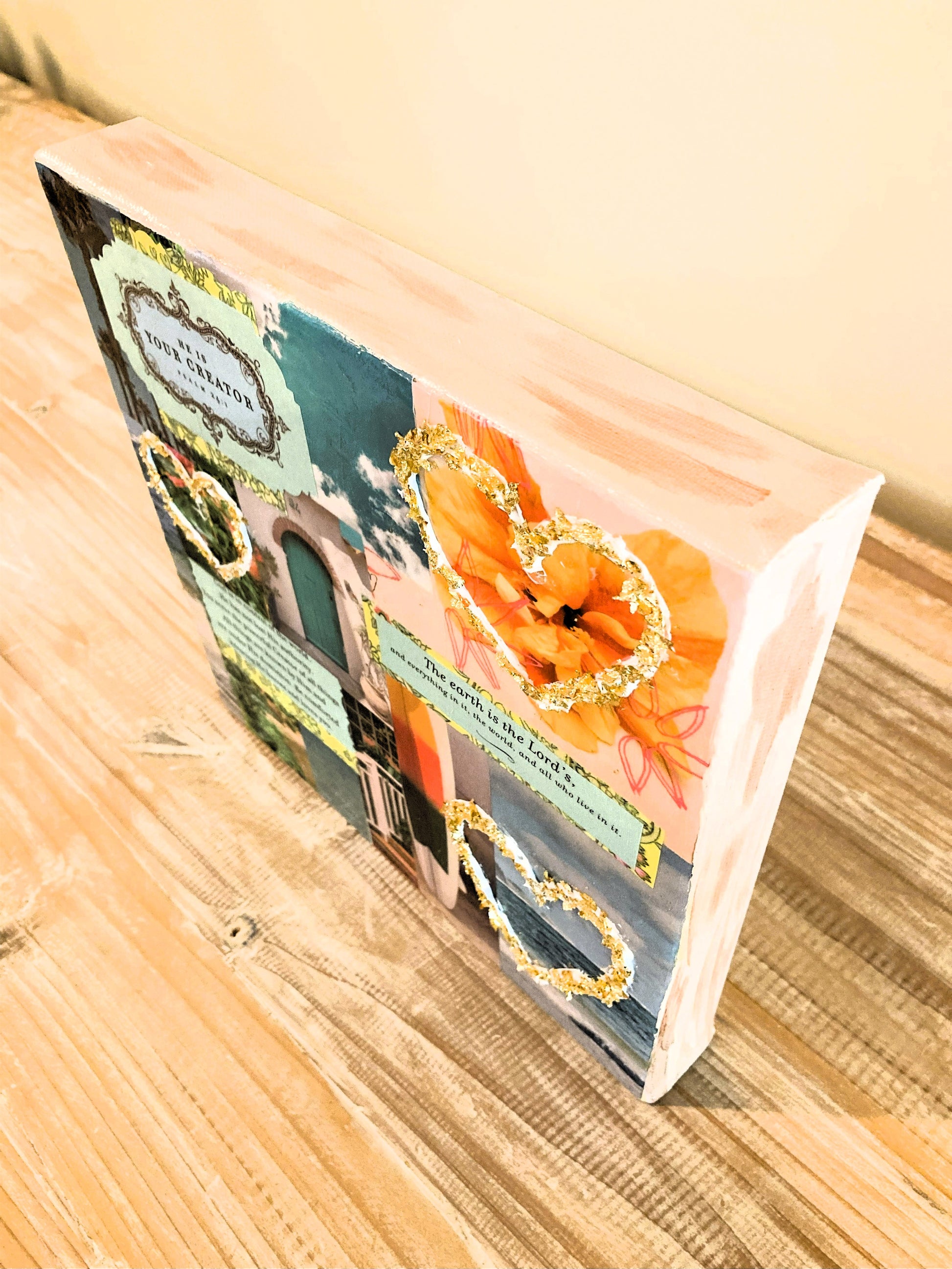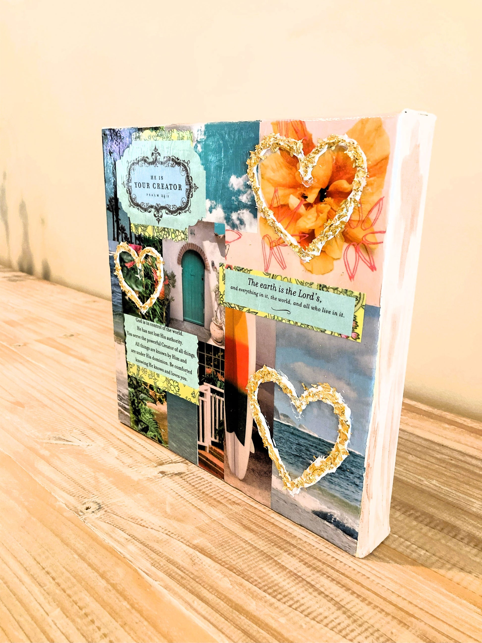 10" x 10" original acrylic painting on hearty weight-bearing canvas with mixed media art. Sealed with a clear coat of high gloss paint. There are thick hearts made of modeling paste with flecks of gold pasted into the hearts.